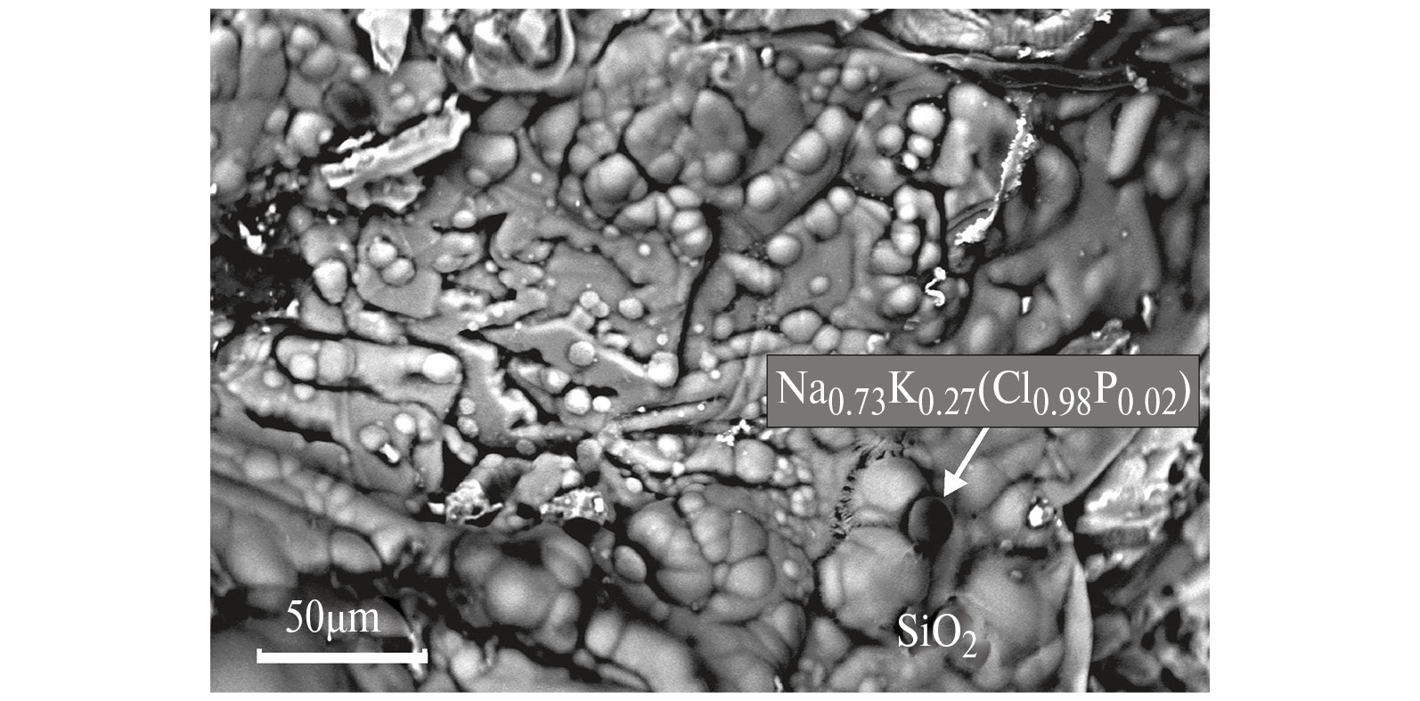 Из других типов сферических новообразований отметим глобулярные конденсатные выделения аморфного кремнезема на поверхности щелочного базальта (рис. 10). Здесь же присутствует глобула солевой фазы Na0,73K0,27 (Cl0,98P0,02).