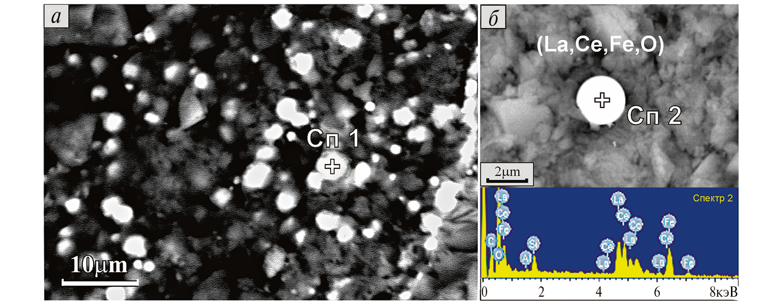 Церианитовые (CeO2) субсферические выделения распространены в аргиллизированном матриксе зеленых сланцев из фундамента Павловского угольного месторождения (рис. 11, а). Размеры этих частиц колеблются от ~4 мкм до первых сотен нанометров. Их состав (табл. 8, Сп1) высокоцериевый с концентрацией Ce до 37,31 мас.%. Здесь же встречены обособленные идеальные шарики, состоящие из гидрооксидов редкоземельных элементов La и Ce (рис. 11, б).