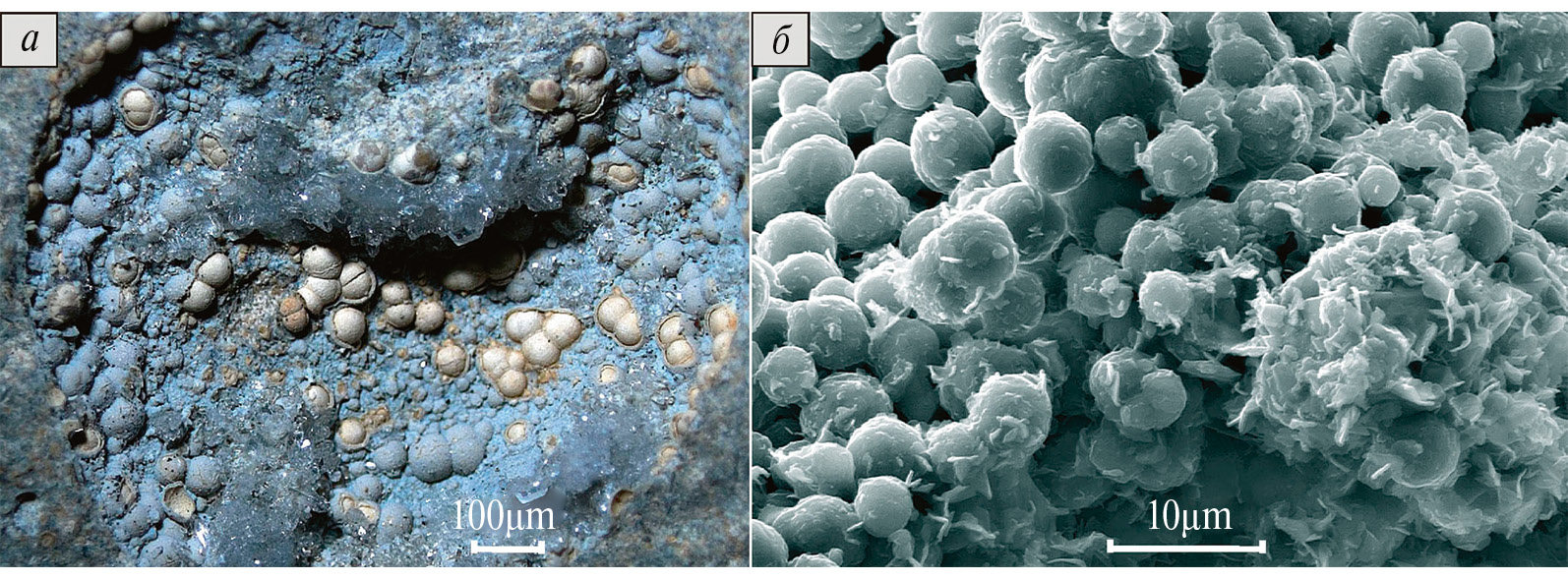 Рис. 12. Смектитовые сфероидные агрегаты из полостей в углекислотно аргиллизированном базальте (а); б – шаровидные выделения смектит-сидеритового состава (Гусевское месторождение каолина). Снимок (а) получен в оптических лучах, снимок (б) – во вторичных электронах