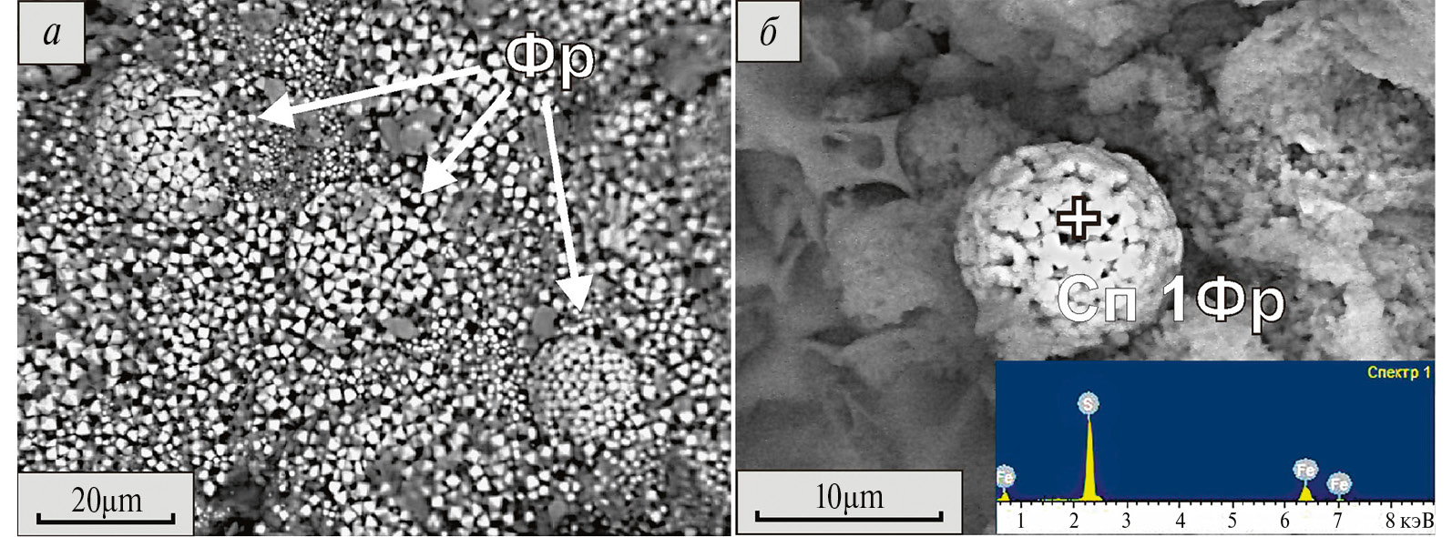 Рис. 14. Фрамбоиды пирита (Фр) среди массовых выделений микрокристалликов пирита (а); б – обособленный фрамбоид пирита с точкой ЭДР анализа Сп1. Снято в упруго-рассеянных электронах