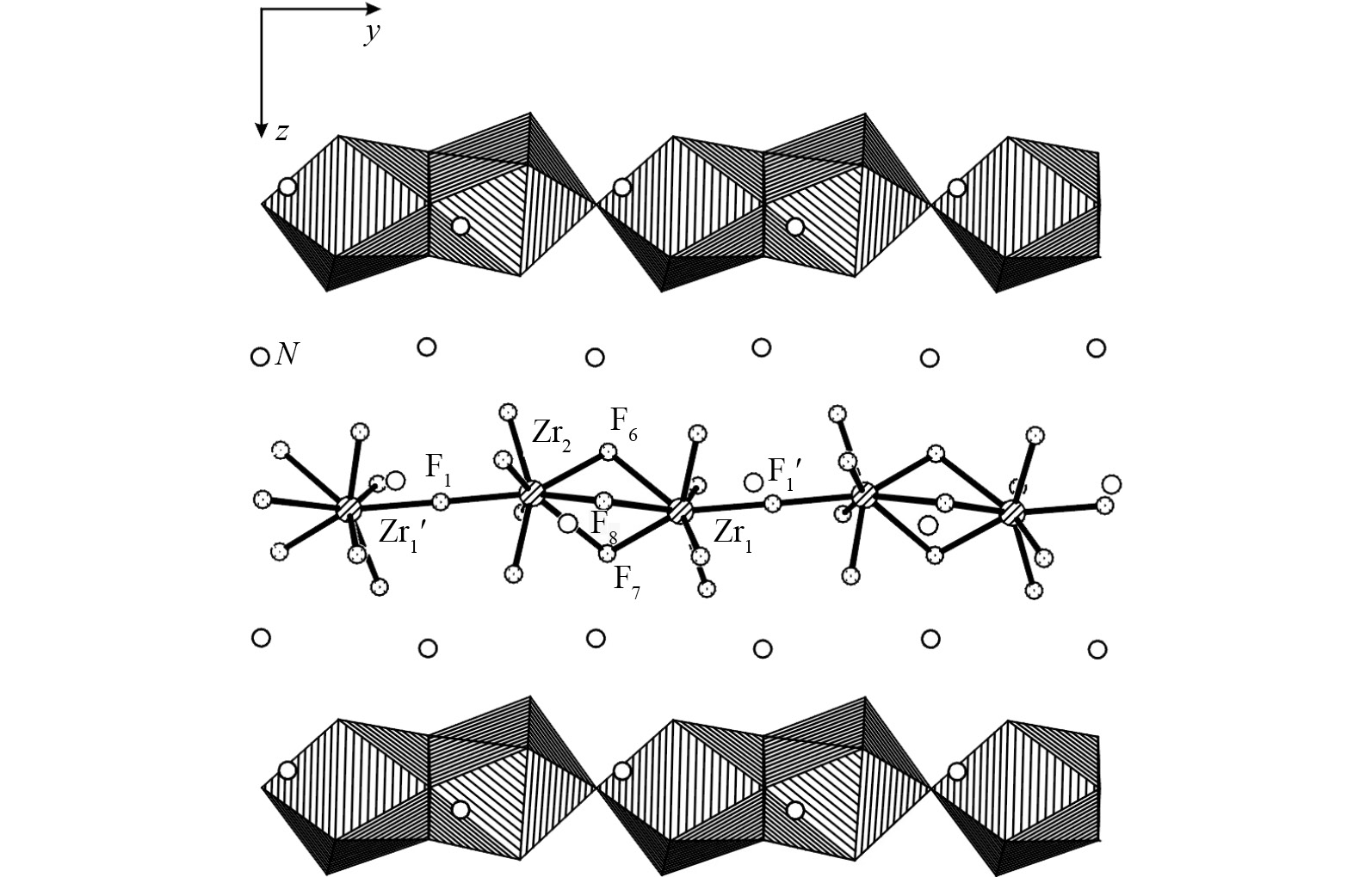 Атом фтора во фторидоцирконатах может выступать в качестве связующего или «мостикового» и образовывать две связи Zr-F-Zr, близкие по длине. Встречаются также и тройные мостиковые связи, когда атом фтора является общим для трех полиэдров циркония. Объединение полиэдров циркония происходит по общим вершинам, ребрам или граням. Степень связи полиэдров между собой зависит от состава соединения – отношения числа атомов фтора к числу атомов циркония в комплексном анионе, которое может быть положено в основу систематики кристаллических структур фтороцирконатов и фторогафнатов [6]. В большинстве этих структур фтор входит в координацию атомов циркония, и отношение F:Zr, взятое по брутто-формуле, совпадает с отношением, положенным в основу классификации в [6], однако имеется и ряд исключений. Катион в структуре выступает как агент, приводящий к деполимеризации соединения, и, таким образом, с увеличением отношения F:Zr имеется тенденция к переходу от каркасных структур к слоистым, цепочечным, олигомерным и, наконец, к островным [6–8]. Интересно, что тот же эффект наблюдается и для смешанно-лигандных соединений – введение в структуру ионов фтора приводит к понижению ее размерности [9]. Можно заметить, что полностью размерность структуры указанными отношениями не определяется – так, структуры (NH4)2ZrF6 и K2ZrF6 являются цепочечными, а структуры гексафторидоцирконатов лития, рубидия и цезия – островными. Структура фтороцирконата, несомненно, определяется количеством и ионными радиусами внешнесферных катионов, приходящихся на один атом циркония, а также наличием гетеролигандов, в качестве которых могут выступать кислород или молекулы воды.