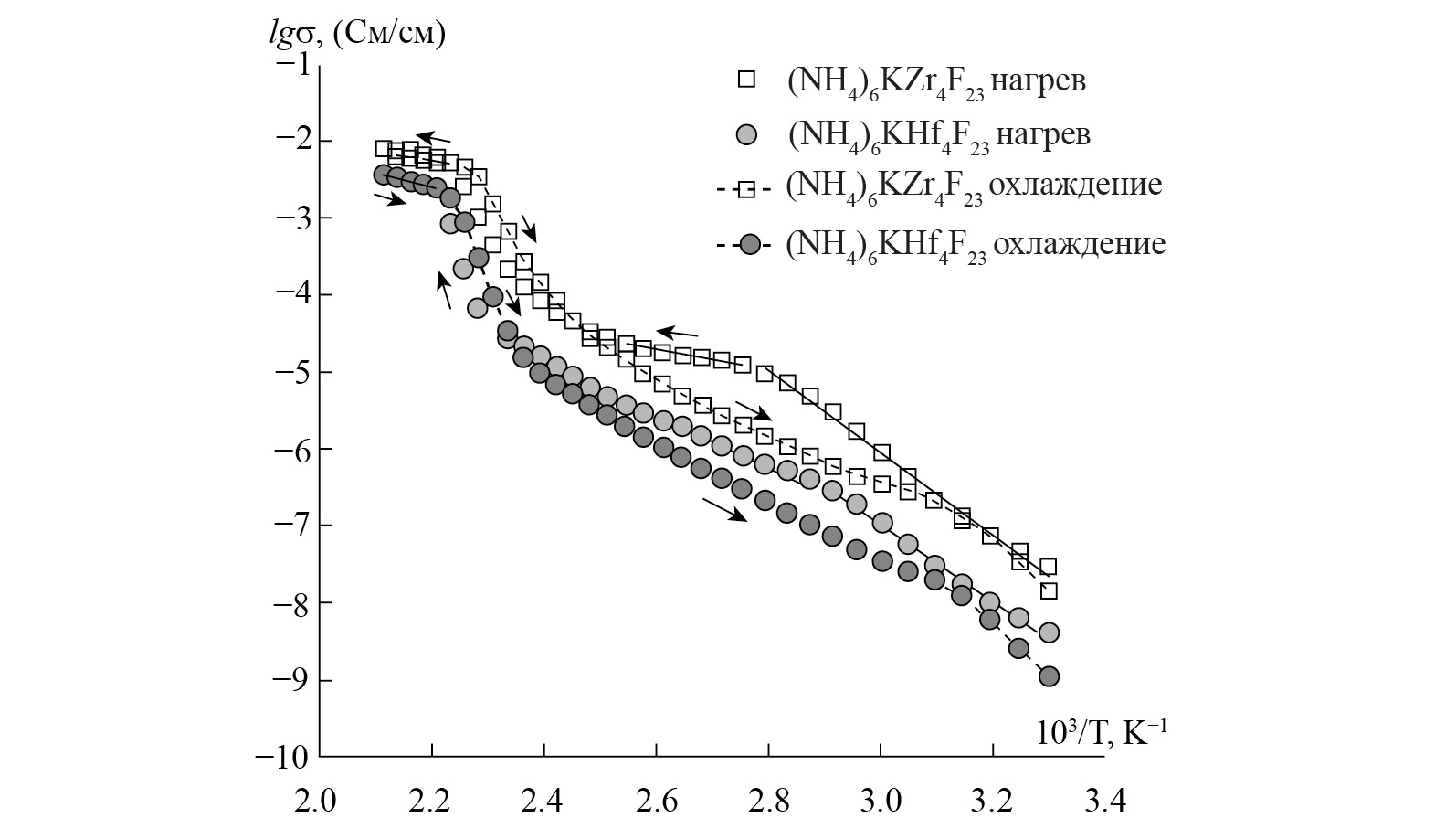 Электропроводность рассматриваемых соединений до и после фазового перехода подчиняется аррениусовской зависимости: σT = Aexp(–Ea/kT), где А – предэкспоненциальный множитель, значение которого определяется механизмом проводимости, Ea – энергия активации переноса заряда, рассчитываемая из тангенса угла наклона прямолинейных участков. В результате фазового перехода в области 378–393 K происходит резкое увеличение значений проводимости на порядок и уменьшение энергии активации переноса заряда. При охлаждении и повторном нагреве, как правило, наблюдался гистерезис значений электропроводности, причем как величина гистерезиса, так и вообще детали температурной зависимости электропроводности имели индивидуальные особенности для разных соединений. Так, хотя величина ионной электропроводности Li(NH4)6Zr4F23 при 420 K совпадает с электропроводностью (NH4)6NaZr4F23, ход температурной зависимости электропроводности последнего отличается намного меньшим гистерезисом [66]. Для K(NH4)6Zr4F23 и K(NH4)6Hf4F23 при повторных прогревах низкотемпературный участок был линейным только при охлаждении (рис. 4).