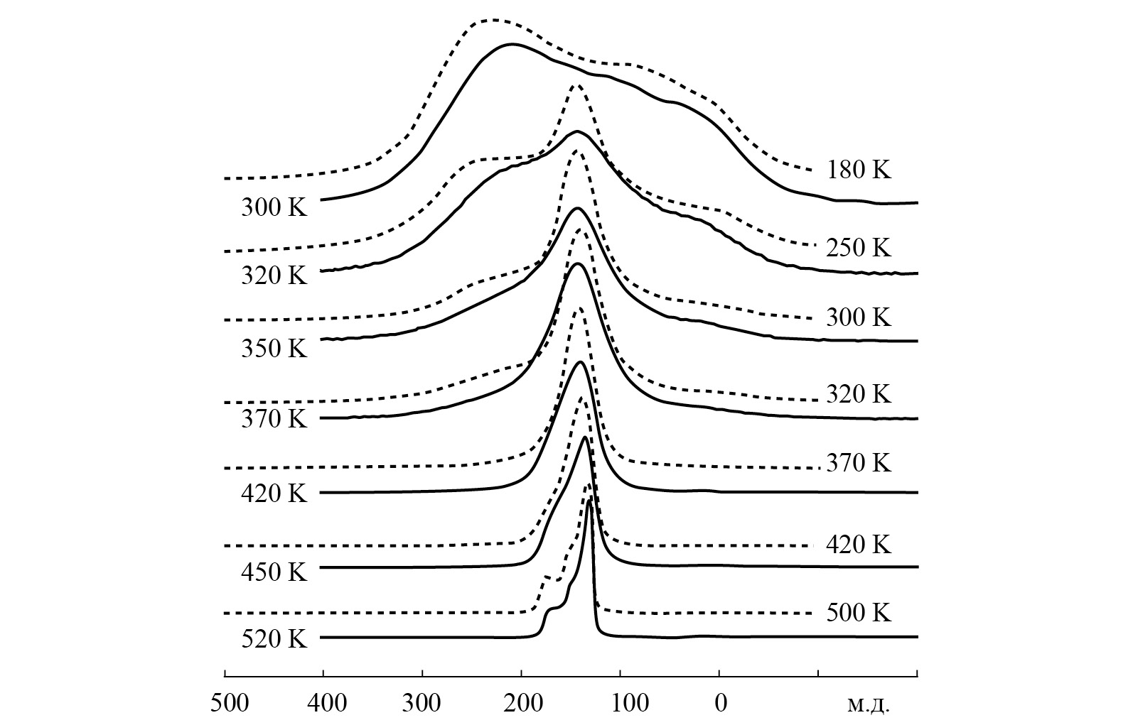 Выше 350 K начинается новая трансформация спектров ЯМР 19F, связанная с началом диффузионных движений ионов фтора: относительно симметричная линия в спектре ЯМР трансформируется в две компоненты, одна из которых представляет собой линию, соответствующую аксиальной анизотропии тензора химического сдвига, а другая – лоренцеву линию с интегральной интенсивностью, достигающей 6 и 19% от общей площади спектров ЯМР 19F соединений (NH4)6LiZr3HfF23 и (NH4)6LiZrHf3F23 соответственно. Значения параметров тензоров равны: δ|| ≈ 178 м.д., δ^ ≈ 131 м.д. и δiso ≈ 146 м.д. для (NH4)6LiZr3HfF23, δ|| ≈ 162 м.д., δ^ ≈ 117,5 м.д. и δiso ≈ 132 м.д. для (NH4)6LiZrHf3F23 (сдвиги приведены относительно C6F6). Охлаждение образцов Li(NH4)6Zr4F23 и Na(NH4)6Zr4F23 (нагретого до 440 K) до 330 K указывает на наличие гистерезиса в изменении величины второго момента и формы спектров ЯМР, что с учетом данных ДСК свидетельствует образовании метастабильных разупорядоченных β-фаз с высокой ионной подвижностью (диффузией) в аммонийной и фторидной подсистемах.