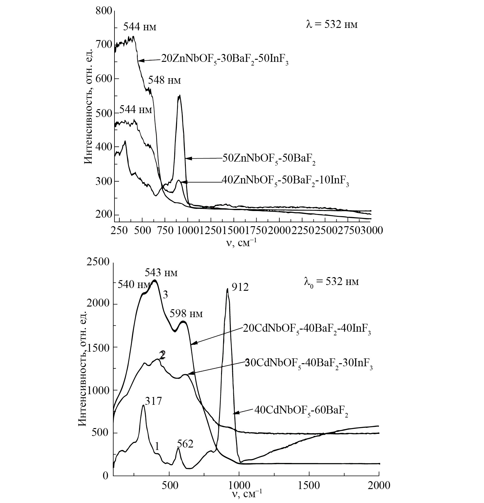 Совсем иная ситуация наблюдается в спектрах КР стекол в системах CdNbOF5-BaF2-InF3 и ZnNbOF5-BaF2-InF3. В области спектра ниже 700 см-1 располагаются широкие интенсивные полосы, на фоне которых можно выделить только полосу, характеризующую колебания ν(Nb=O), и то только в случае низкого (10 моль%) содержания трифторида индия. С подобной ситуацией мы встречались неоднократно при изучении образцов, содержащих трифториды РЗЭ [7, 12, 19]. Во всех случаях было доказано, что причиной наблюдаемого эффекта является присутствие вклада фотолюминесценции в спектры неупругого рассеяния света, связанного с наличием в стеклах центров, обладающих люминесцентными свойствами. В данном случае мы также имеем дело со спектрами неупругого рассеяния света, в которые дают вклад фотолюминесценция и спектр комбинационного рассеяния. Вклад фотолюминесценции соответствует уровням эмиссии 542, 573 и 673, 751 нм. Интенсивность полос, обусловленных этим вкладом, растет с увеличением содержания трифторида индия в системе. Такой вклад отсутствует в спектрах стекол, не содержащих трифторид индия (рис. 5). В отсутствие в составе стекла трифторида индия мы наблюдаем спектр КР стекла, в котором присутствуют только полосы, характеризующие колебания оксифторниобатных полиэдров. Исходя из этого логично предположить, что вклад фотолюминесценции связан с присутствием в составе стекла трифторида индия.