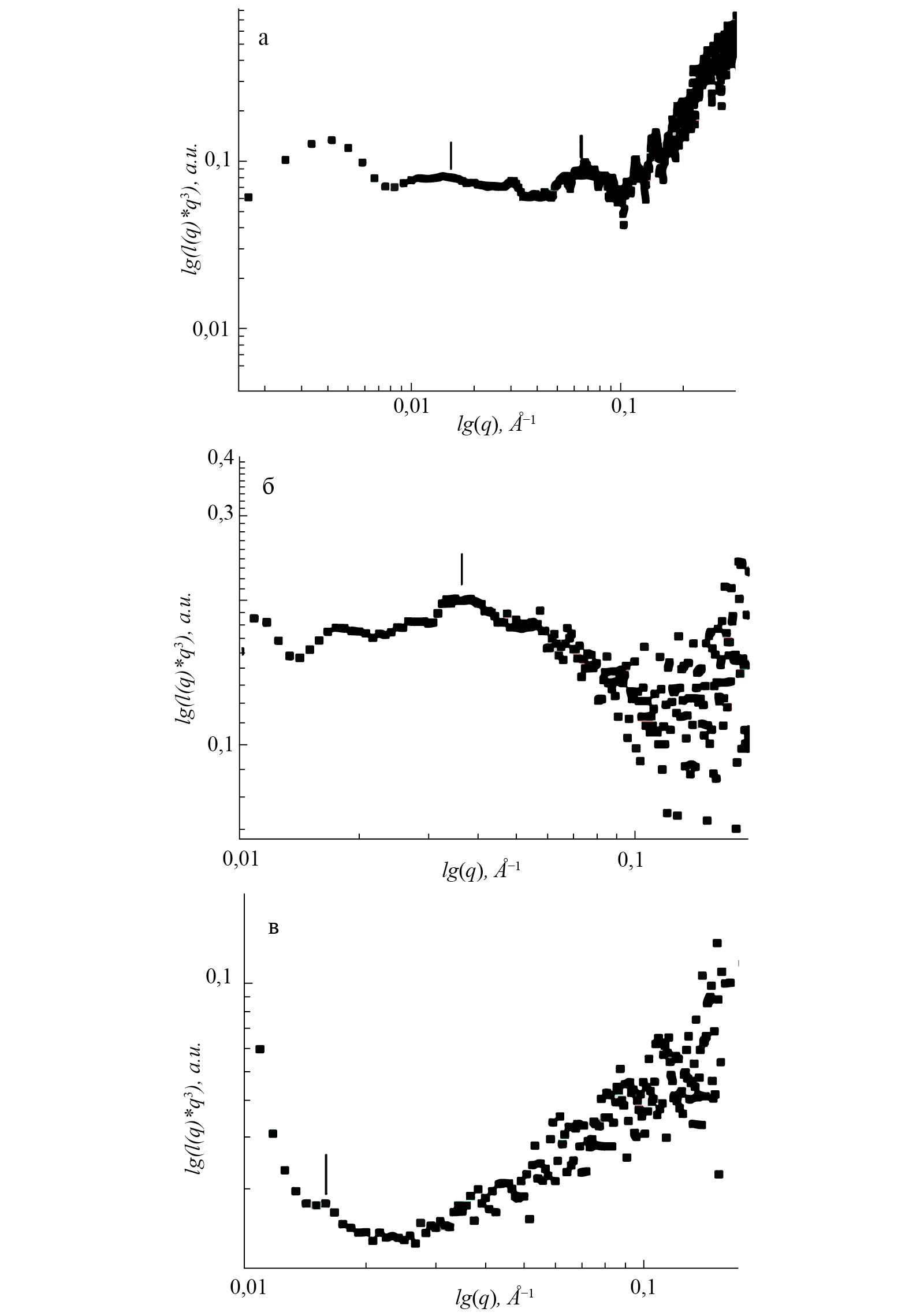Измерения малоуглового рентгеновского рассеяния (МУРР) проводили на рентгеновском спектрометре диффузного типа S3-MicroPIX (Hecus X-Ray Systems GmbH). Первичный рентгеновский пучок генерировали с использованием облучателя Genix (Xenocs) с длиной волны CuKα (λ = 0,154 нм) при 30 кВ и 0,3 мА. При наличии максимума на зависимостях I(q) × q2, значение qmax использовано для оценки среднего размера частиц с использованием радиуса псевдогинье [22] (1). Диаграммы рассеяния в геометрии пропускания были получены в диапазоне волновых векторов q ≈ 0,001–0,23 Å–1.