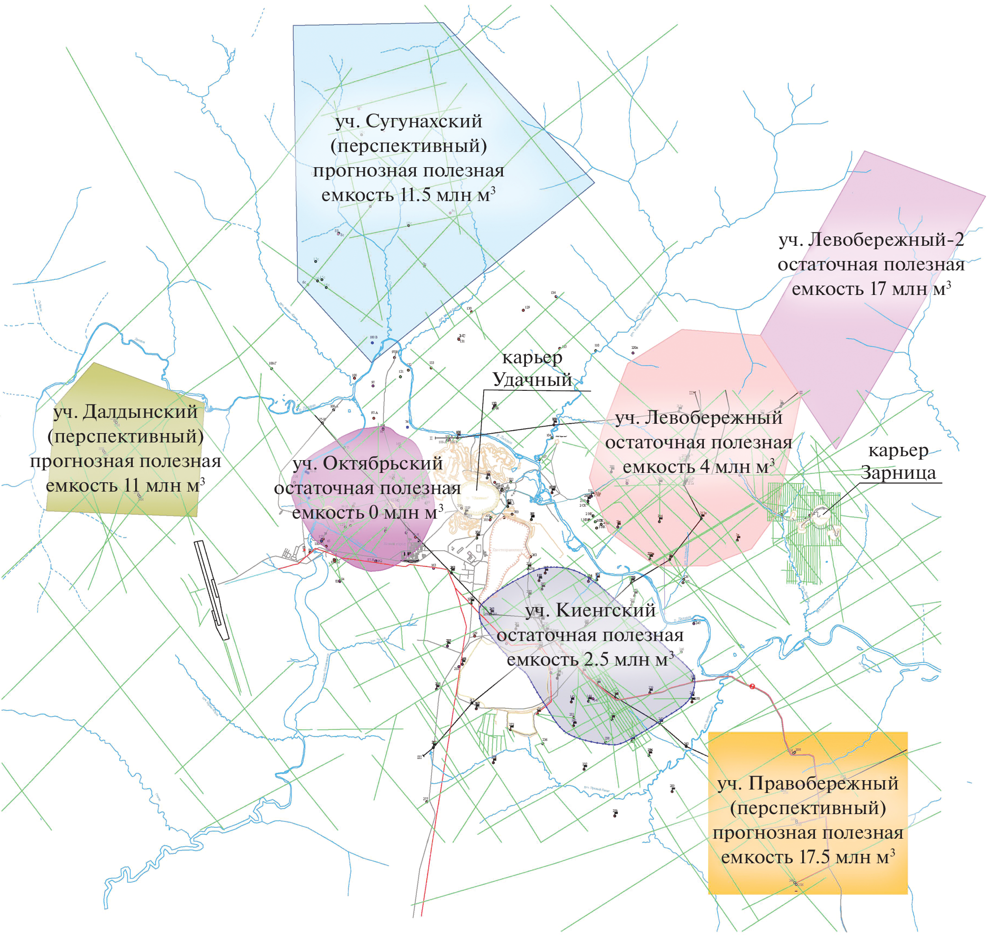 Environmentally friendly disposal of drainage water arising from the development of diamond tubes is currently becoming very acute for reducing technogenic load on the environment and for introducing new methods and technical solutions. Drainage water from the Daldynskoe kimberlite field were pumped into the Oktyabrsky (1985–2002), Kiengsky (2003–2012), and Levoberezhny (2012–2023) sites at different periods of the deposit development. Currently, Levoberezhny-2 site is being used, which has partially exhausted its useful capacity. As a result, the task was set to determine the possibilities for the further use of permafrost reservoirs in the study area, to identify and evaluate the most promising areas for future injection. The objects of study include the Upper Cambrian strata in the permafrost bottom, below the main erosion bases in the study area. A set of search features (criteria) of structures suitable for pumping drainage water into permafrost has been identified. These are tectonic, structural, geophysical, gas-dynamic, geomorphological, hydrogeological, temperature criteria. Taking into account the analysis of the available information on cryohydrogeological, lithofacial and structural-geological structure of the study area, a forecast map of areas that are promising for geological study and further trial operation was compiled, with an assessment of their useful volumes. The most promising areas are Daldynsky, Pravoberezhny and Sugunakhsky sites. The preliminary estimated useful volumes of these areas, in the case of the use of already developed technologies, are: Daldynsky ~11 million m3; Pravoberezhny ~17.5 million m3; and Sugunakhsky ~11.5 million m3. In other words, with projected drainage water inflow, the considered areas will allow additional pumping of ~40 million m3, which will ensure further environmentally safe mining of the Daldynskoe kimberlite field at least until the mid-2030s. The suggested method of pumping drainage water can be used in related industrial fields for mining not only kimberlite pipes, but also other solid minerals in the permafrost zone.