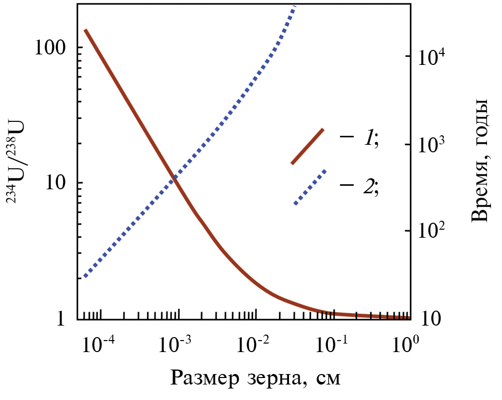 3. Fig. 2. Change in the ratio 234U/238U (curve 1, scale on the left) and the time of establishment of radioactive equilibrium in pore water (curve 2, scale on the right) depending on the size of the elementary grain at concentrations of uranium in the matrix [U]MATR = 3 micrograms/g, [U]PORE = 3 ng/g and the recoil track length is 234Th / = 55 nm (adapted from [24] and calculated according to the model [29]).