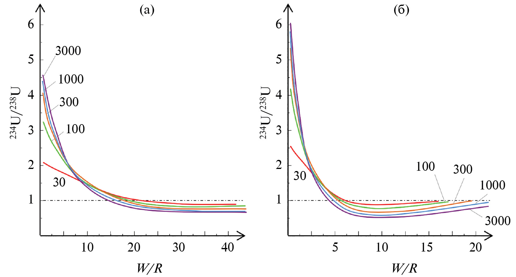 Рис. 6. Вариант расчета 234U/238U в поровой воде для двухстадийной модели: а — при отсутствии пленочной влаги, б — при наличии пленочной влаги в ММГП; параметр W/R — отношение объема профильтровавшейся воды к объему зерна; цифры около кривых — отношение DТРЕК/DМАТРИЦА; остальные обозначения на рис. 5.