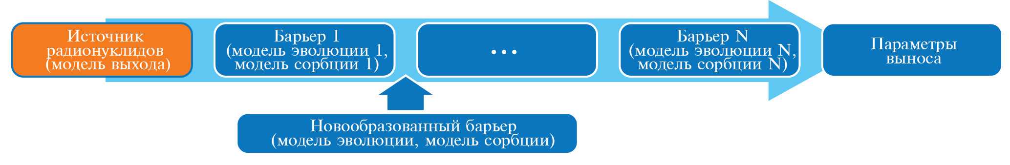 Согласно НП-055-14 и др., прогнозирование эволюции ПГЗРО требует использования математических моделей. Для финальной оценки его безопасности следует создать реалистичную и правдоподобную модель выхода радионуклидов за пределы существующих и новосозданных барьеров безопасности. Общая схема формирования интегральной модели прохождения радионуклида сквозь каскад эволюционирующих барьеров безопасности ПХРО1/ПГЗРО представлена на рис. 1 [2, 3]. Частью этой концептуальной модели будет модель выщелачивания стекломатрицы в присутствии бентонита, учитывающая их взаимовлияние.