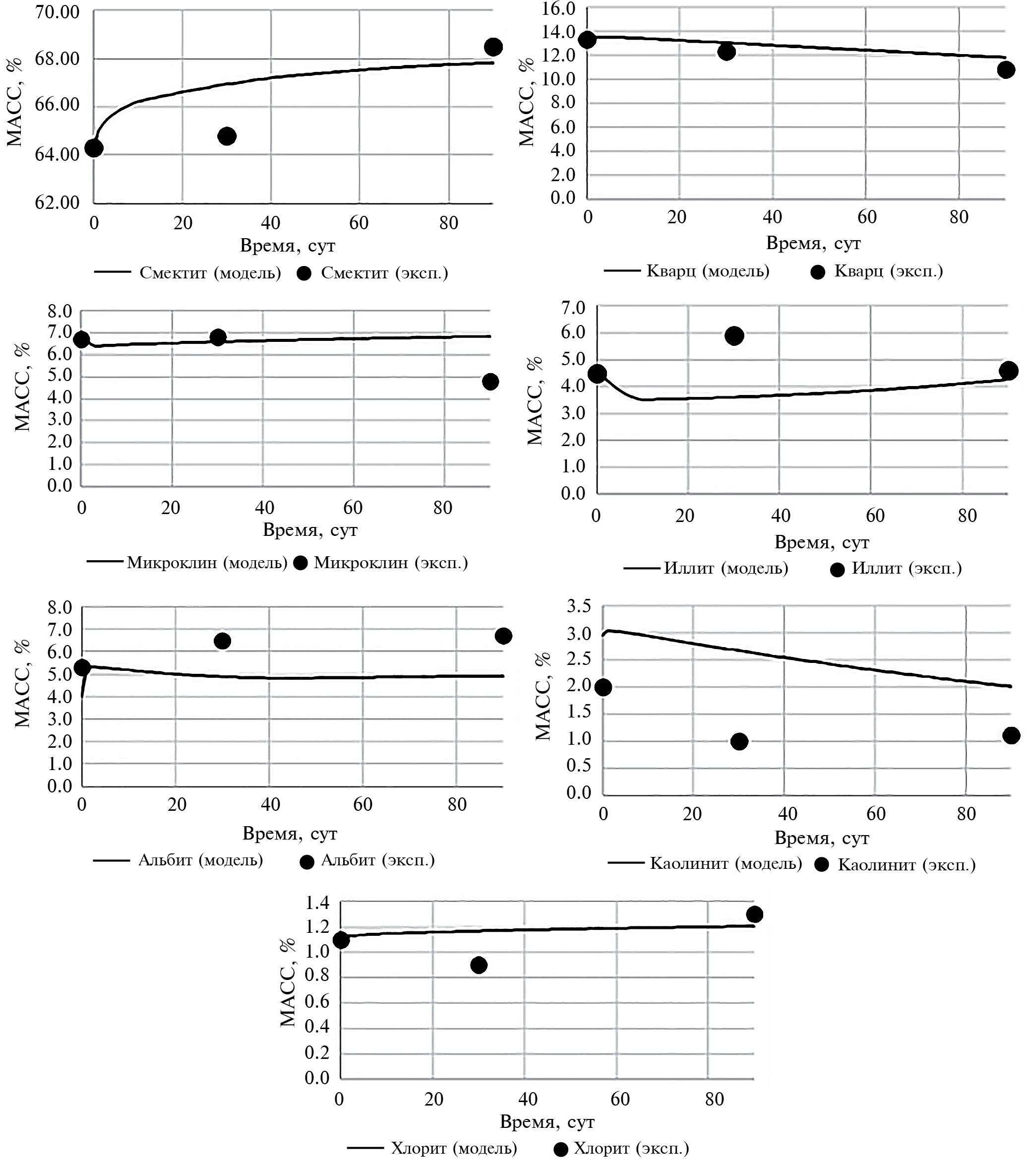 Рис. 3. Результаты сравнения модельных и экспериментальных данных по моделированию трансформации фаз бентонита месторождения 10-й Хутор в щелочных условиях.