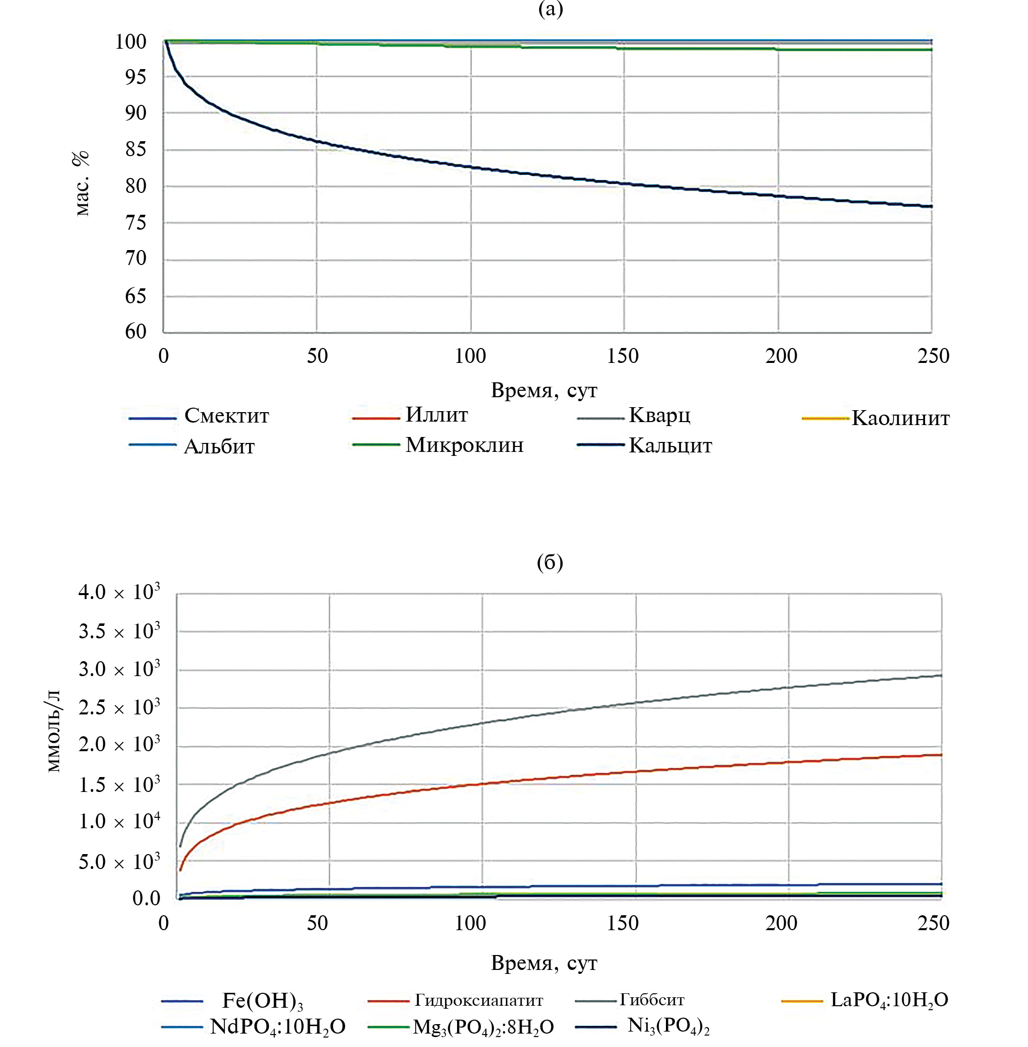 Рассмотрим изменения фазового состава (рис. 5). Модель демонстрирует малую трансформацию глинистых фаз, формирование вторичных фаз гиббсита, восьмиводного фосфата магния, гидроксиапатита, фосфата неодима, лантана, никеля, гидроксида железа. Именно эти фазы и будут формировать коррозионный слой стекла, блокируя его поверхность.
