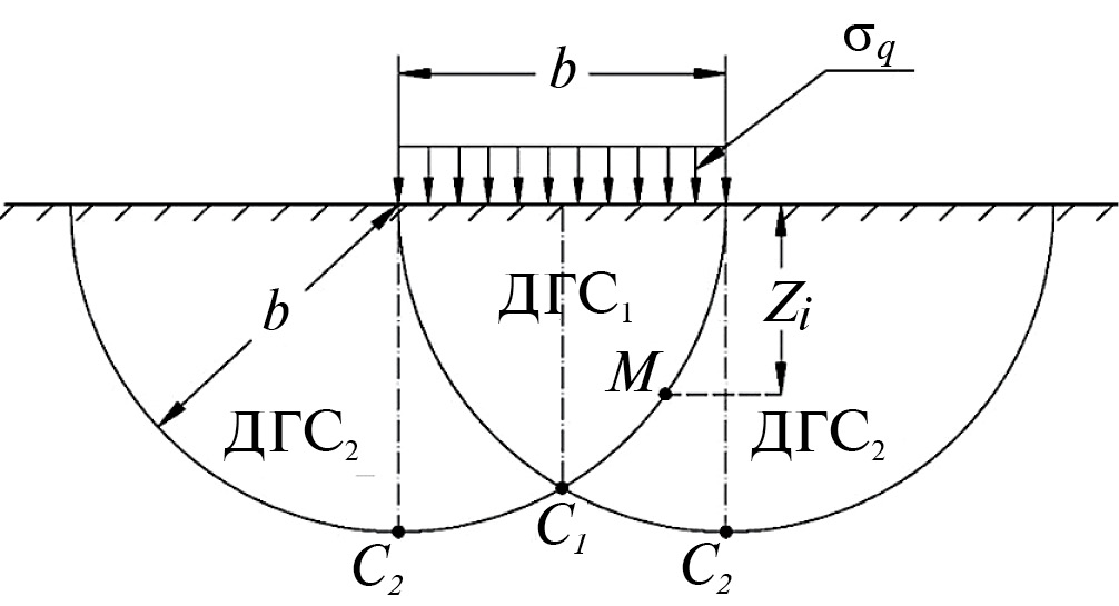 2. Fig. 1. Diagram of the location of dissipative geological structures in the soil base under load from a belt foundation of width b. σq — pressure on the soil base under the sole of the foundation; DGS1 and DGS2 are dissipative geological structures in the soil base.
