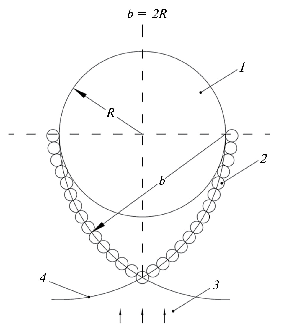3. Fig. 2. The position in the plan of a stationary object in the form of a round pile. 1 — a fixed object with a width of b = 2R, 2 — the well, 3 — the direction of movement of the landslide massif, 4 — the boundary surface (shell) of the dissipative geological structure.