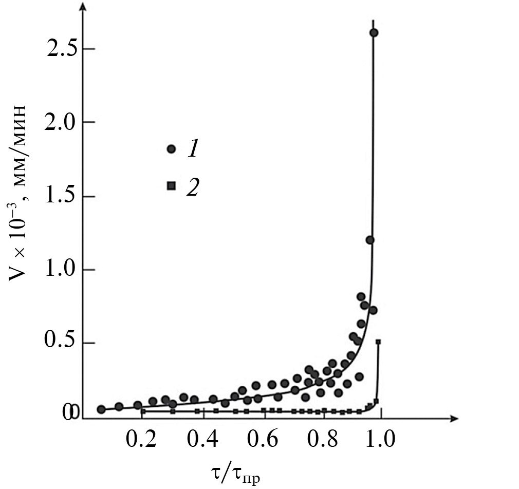 4. Fig. 3. Graphs of the dependence of the creep rate on the stress level at different rates of clay soil loading in shear tests [4]. 1 — test according to the step — hour scheme, 2 — according to the step — day scheme.