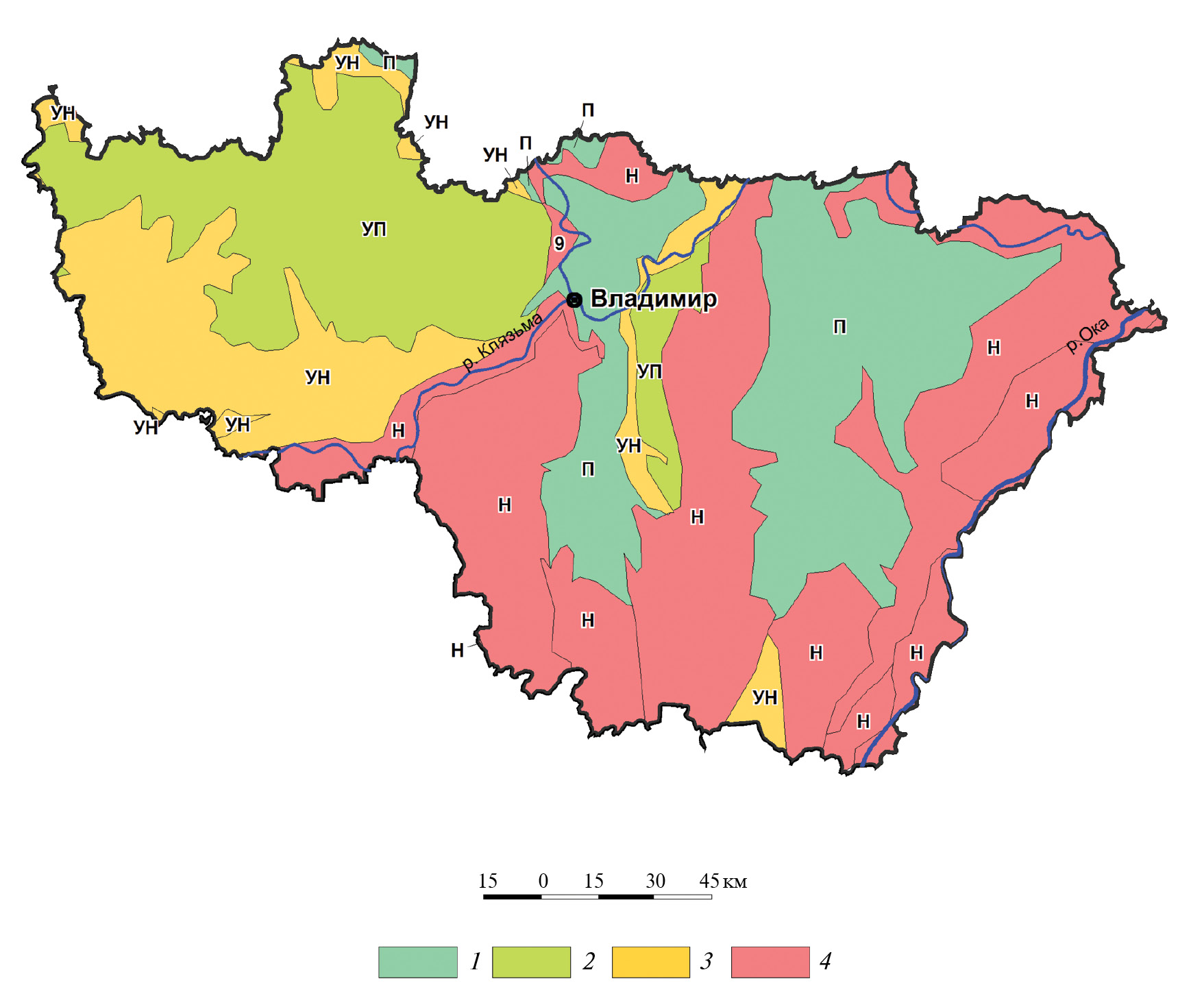На втором этапе исследований проводятся типизация и последующее районирование перспективных территорий в более крупном масштабе с учетом всего комплекса инженерно-геологических условий: геологического строения, гидрогеологических условий и возможного развития опасных экзогенных процессов и явлений. Рассмотрим такую типизацию на примере одной административной части ЦФО — Владимирской области (см. рис. 1). Выбор данной административной единицы обусловлен несколькими причинами. С геологической точки зрения, территория этого региона, расположенная в пределах Восточно-Европейской платформы, характеризуется типичными для платформенных областей инженерно-геологическими условиями, здесь развит весь спектр природных процессов, свойственных равнинным территориям, что важно для решения задач настоящего исследования. С социально-экономической точки зрения, Владимирская обл. — один из наиболее густонаселенных и экономически развитых регионов ЦФО РФ, расположенный на пересечении транспортных коридоров федерального значения, связывающих столичный регион с восточными частями страны, что обусловливает ее огромное транспортно-логистическое значение. Кроме того, здесь сосредоточено большое количество древних памятников истории, архитектуры и культуры, в том числе объектов культурного наследия ЮНЕСКО, а также особо охраняемых природных территорий и заказников. Эти обстоятельства предполагают особо тщательный подход к выбору мест расположения полигонов ТБО на основе комплексной оценки всего спектра условий.