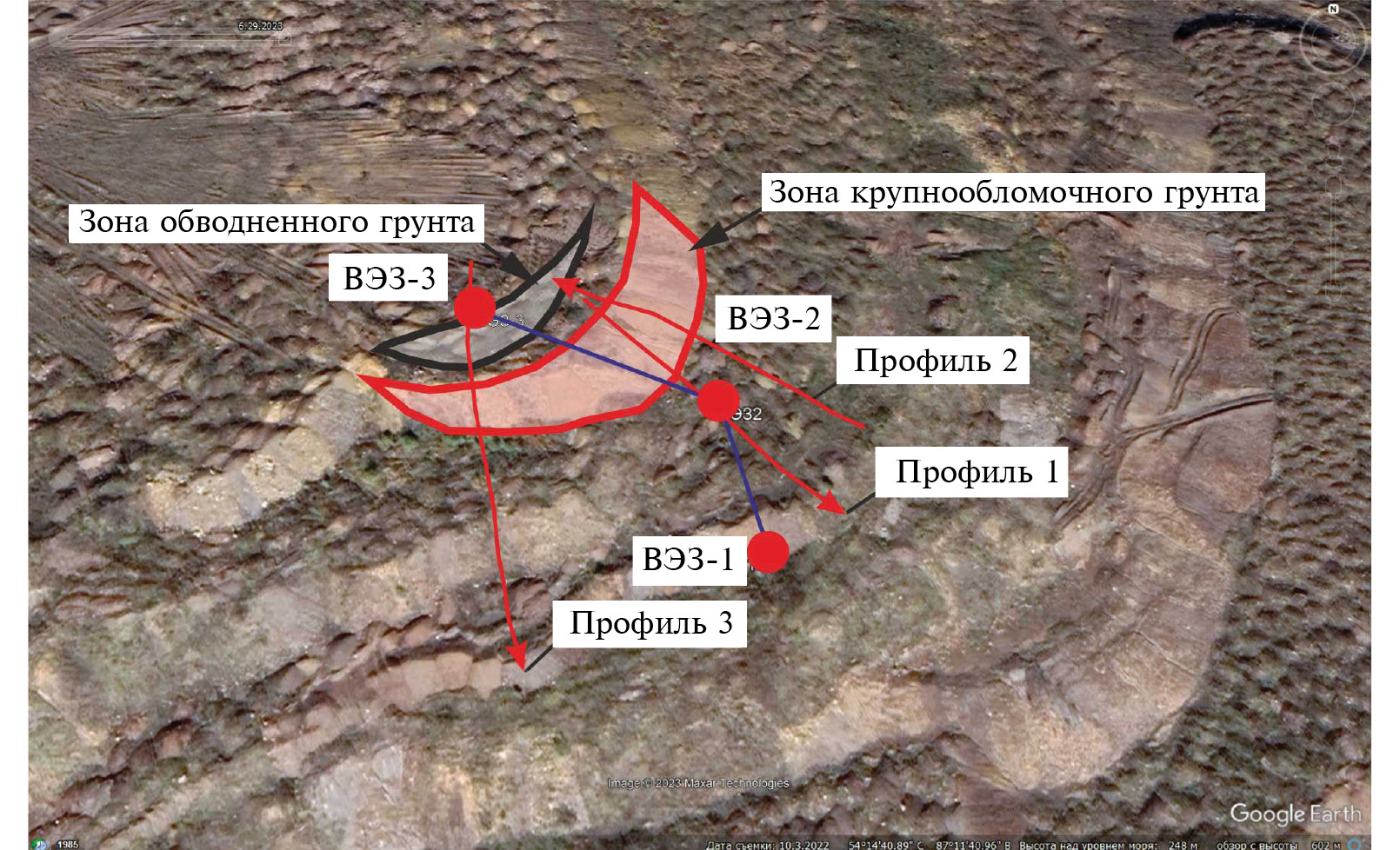 Рис. 1. Схема расположения профилей и зонирования: профили 1, 2, 3 — георадиолокационного профилирования грунтов; ВЭЗ‑1, 2, 3 — профили вертикального электрического зондирования.