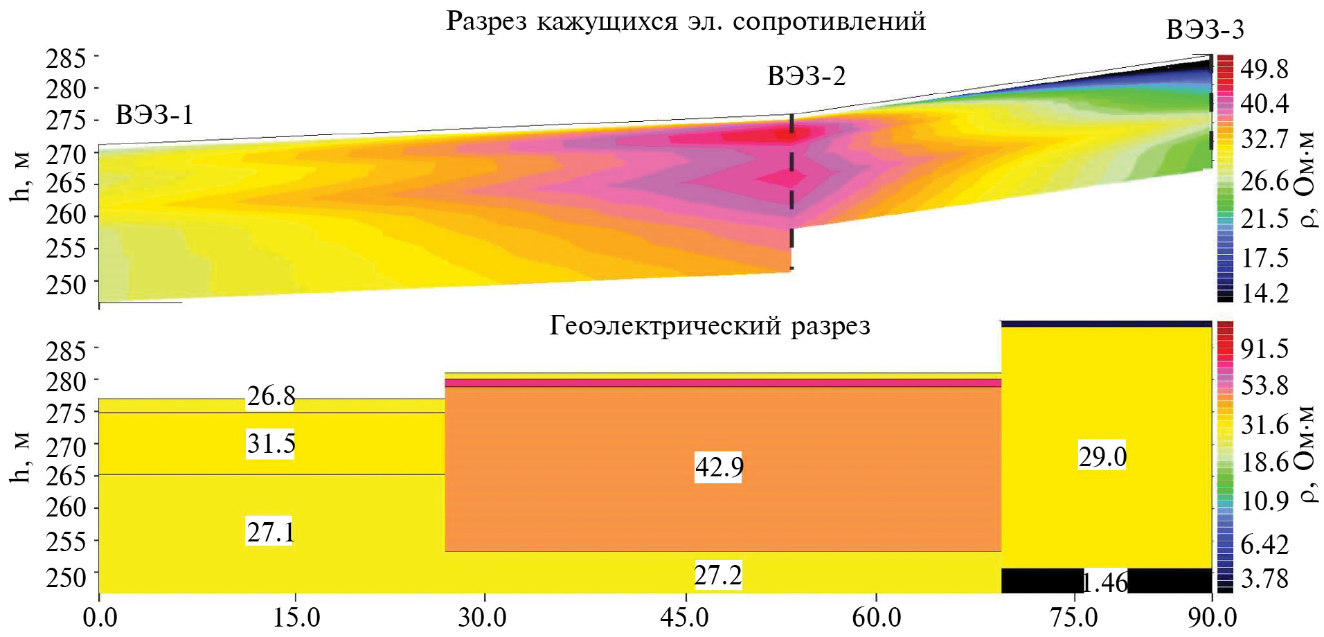 Рис. 3. Геоэлектрический разрез ВЭЗ‑1–2–3.