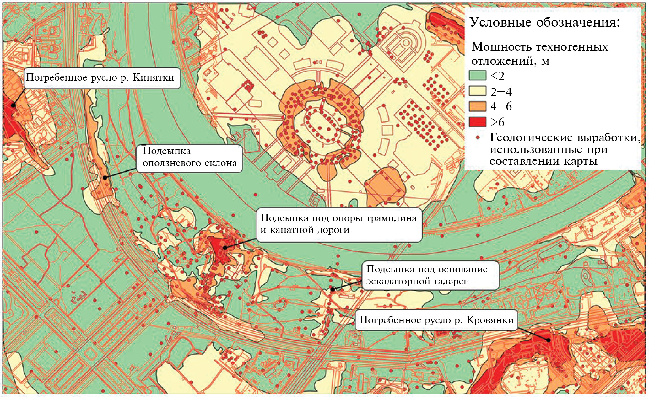 3. Fig. 2. Map-scheme of the thickness of technogenic deposits in the territory of Vorobyovy Gory and its environs (indicating areas of significant transformation of the resource of geological space according to data from the State Budgetary Institution Mosgorgeotrest [10]).