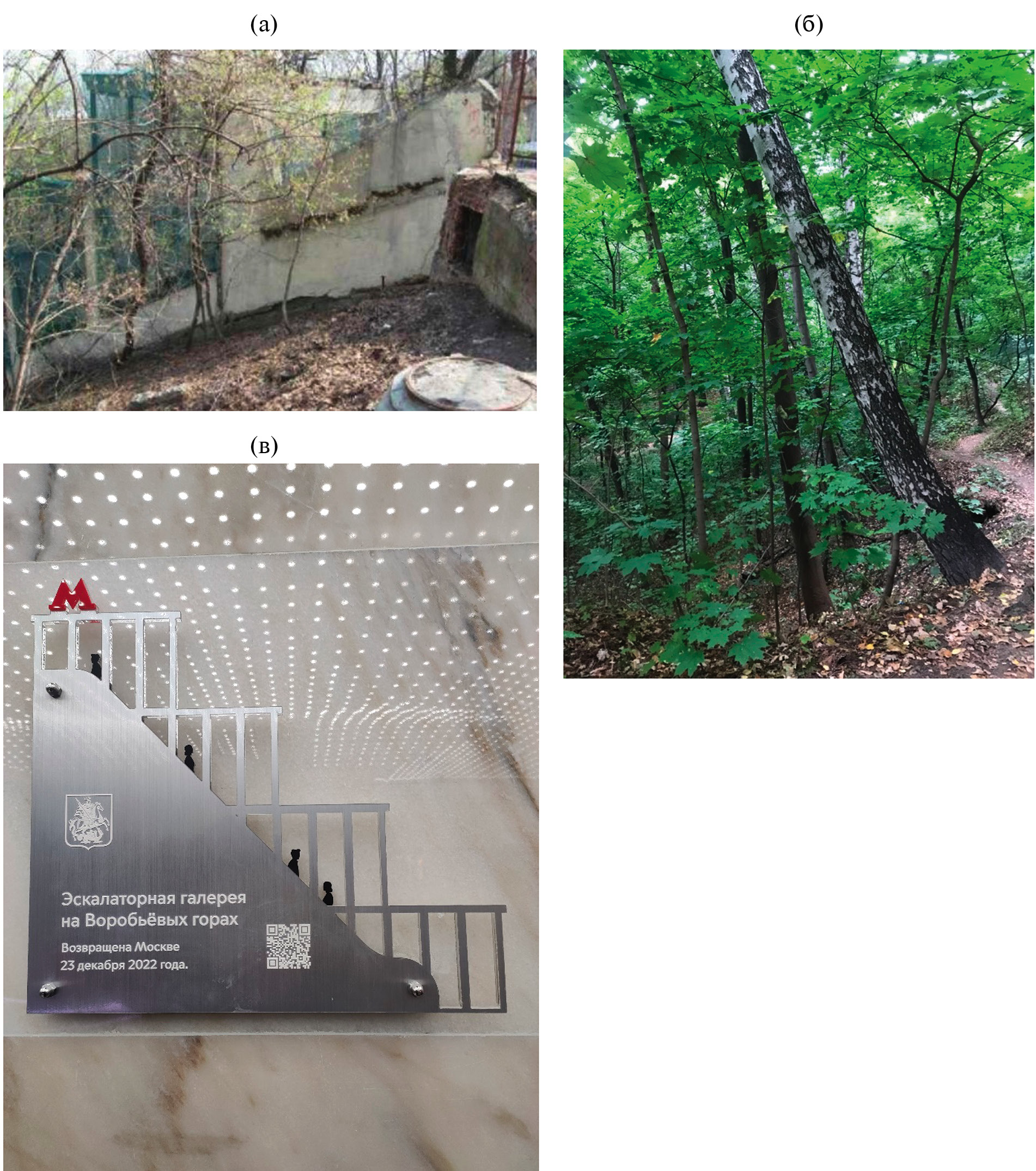 Рис. 4. Историческая визуальная ретроспектива эскалаторной галереи и древостоя на территории Воробьевых гор: трансформация галереи [9] (а) и фитоценозов (б) под влиянием геодинамических процессов; в − реконструкция эскалаторной галереи 23.12.2022 г. – оптимизация рекреационного кластера (Фото Т.А. Барабошкиной, 2023 г.).
