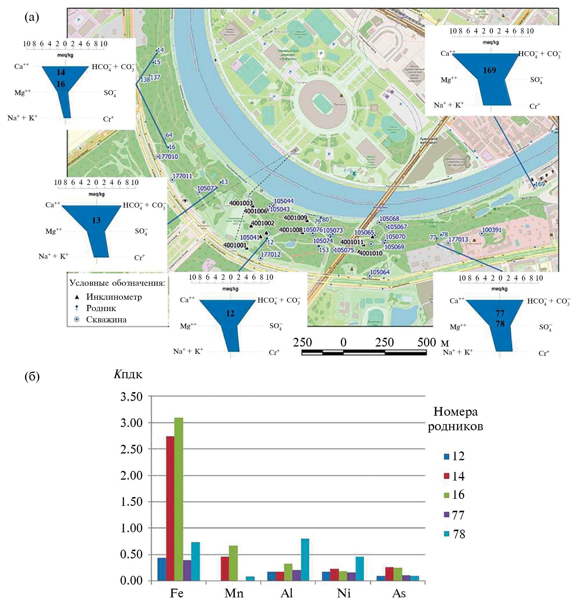 6. Fig. 5. Integrated diagram of the location of monitoring points based on data from the State Budgetary Institution “MosEcoMonitoring” and Stiff’s diagram [31] of the macrocomponent composition of spring waters (a); the content of microelements (in Kpdk values) in the water of springs studied in 2022 (b).