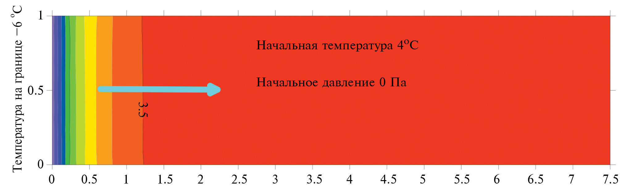 На рис. 1 приведена постановка этой задачи. Изначально в горизонтальной модельной области задана температура +4°C. На левой границе задана постоянная температура –6°C, приводящая к постепенному промерзанию. В аналитической модели оцениваются термодинамическое влияние левой границы и распространение промерзания во времени. На рис. 2 приведено сопоставление расчетов на основе модуля FreezeThaw75 с аналитическим решением на момент времени 1 сут.