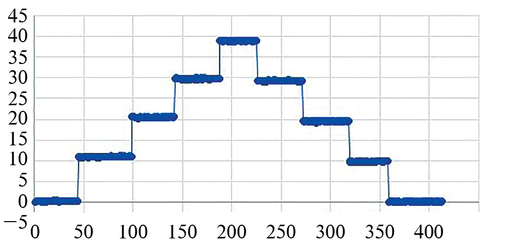 5. Fig. 4. Graph of the substrate plate deformation value versus the load weight. The abscissa axis is the number of measurements during the experiment, the ordinate axis is the values ​​of relative changes in the measured differential capacitance according to the readings from the AD7745 microcircuit, i.e. the substrate plate deformation values ​​in conventional ADC units when the load changes from 0 kg (without load) to 16 kg in 4 kg increments and back to 0 kg.