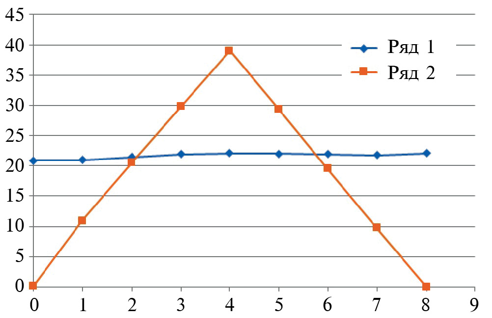 Графики изменения средних значений температуры (ряд 1) и деформаций пластины подложки (ряд 2) во время проведения испытаний представлены на рис. 5.