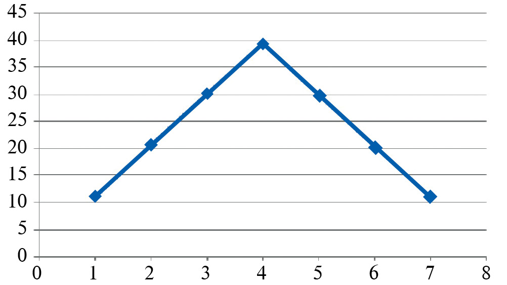 Среднее значение изменения деформации DnD(n–1) от точки до точки на одинаковое изменение нагрузки равно 9.6335 условных единиц, среднеквадратическое отклонение σ = 0.5482. Существует вероятность, что симметричные по нагрузке точки деформации различаются по величине из-за воздействия изменений температуры, так как при повышении или понижении температуры материалы сжимаются или расширяются. В результате эти точки теряют свою симметрию и различаются по величине растяжений.