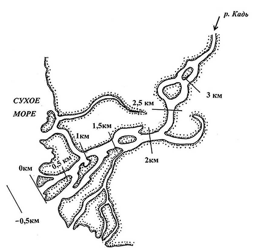 - дельту протяженностью около 1.5 км;