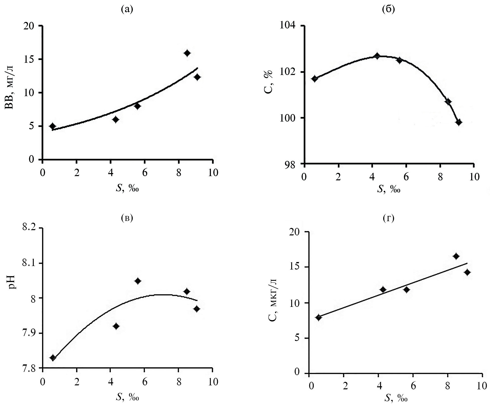 Рис. 2. Графики взаимосвязи солености со взвесью (а), кислородонасыщением (б), величиной рН (в) и содержанием общего фосфора (г) на поверхностном горизонте в устье р. Кадь, 04.09.2021 г.