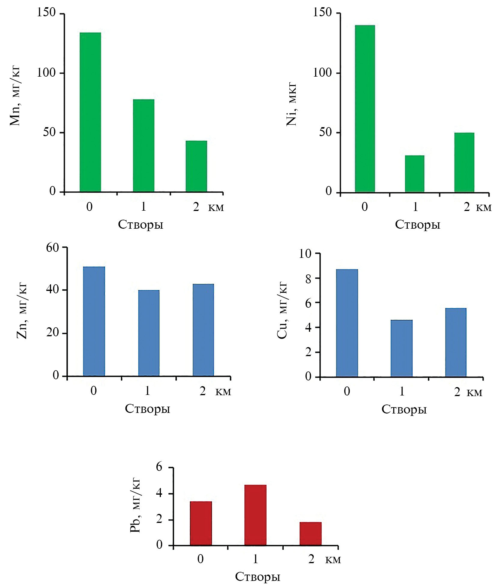 Рис. 3. Пространственное распределение тяжелых металлов в донных отложениях в устье р. Кади в летнюю межень 2021 г.