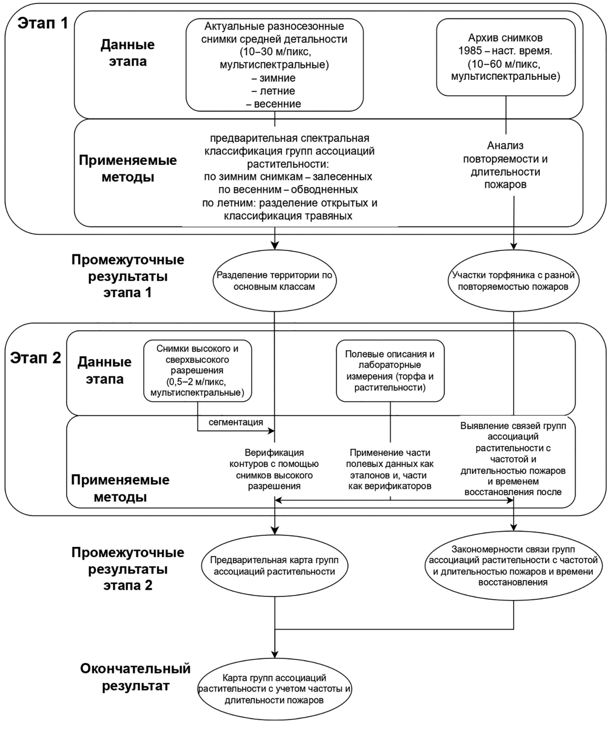 Авторским коллективом разработаны методика детального индикационного картографирования торфяников с помощью космической съемки с опорой на съемку с БПЛА и эталонные описания для оценки пожароопасности. Методика состоит из нескольких этапов: