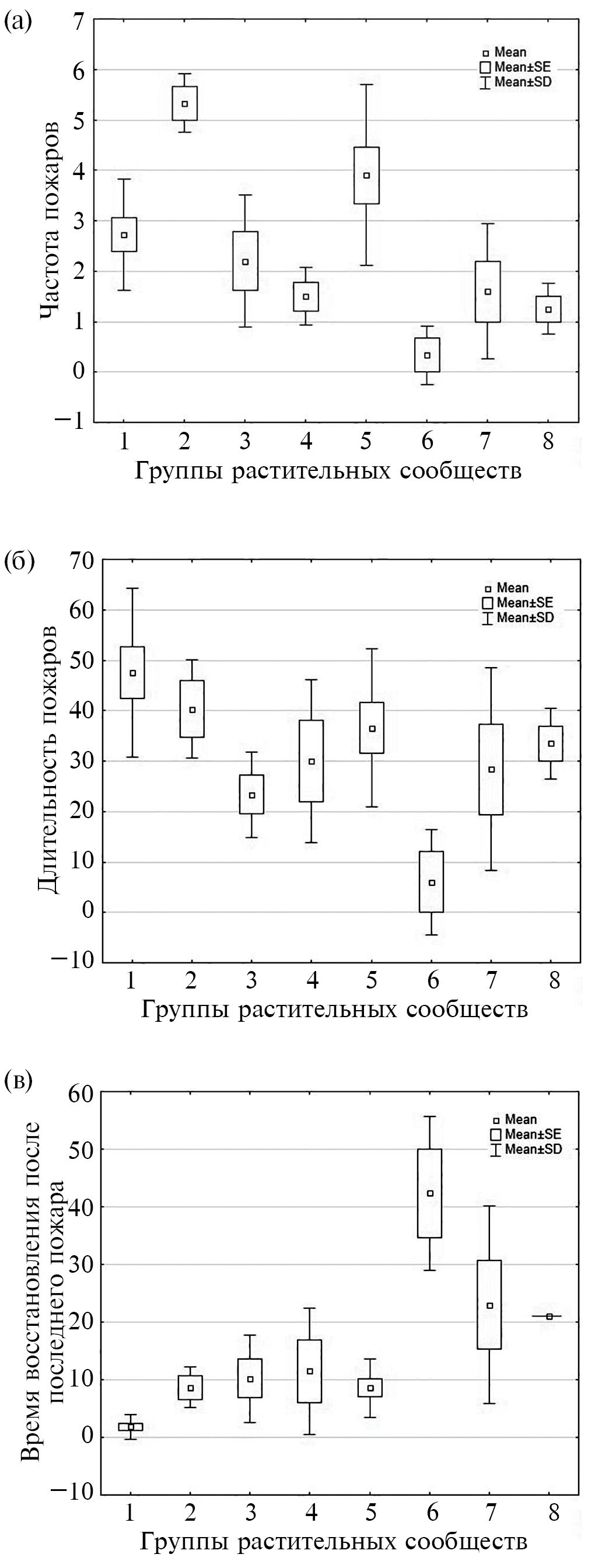 Из анализа табл. 3 можно сделать вывод, что выделенные группы ассоциаций растительности связаны с параметрами прошедших пожаров следующим образом: