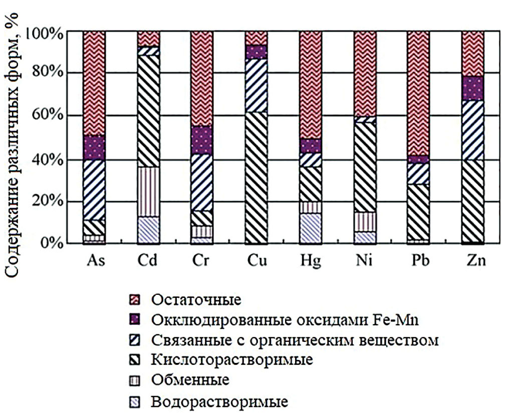 Методом последовательной химической экстракции определено весьма сходное распределение ТМ по формам в ЛЗ обоих заводов. Например, на заводе Jiangqiao (рис. 1) растворимый Cd присутствует в кислоторастворимой, обменной и водорастворимой формах, растворимая Hg – в основном в кислоторастворимой и водорастворимой формах. Растворимый Pb в ЛЗ также присутствует в кислоторастворимой форме, а растворимые As и Zn – в органически связанной и кислоторастворимой формах. Следовательно, выщелачивание этих металлов из ЛЗ в случае попадания ее в окружающую среду в отсутствие кислот относительно затруднено. Однако в природной среде, подверженной воздействию кислотных дождей, вышеупомянутые ТМ могут растворяться и поступать в окружающую среду в течение последующих лет [4].