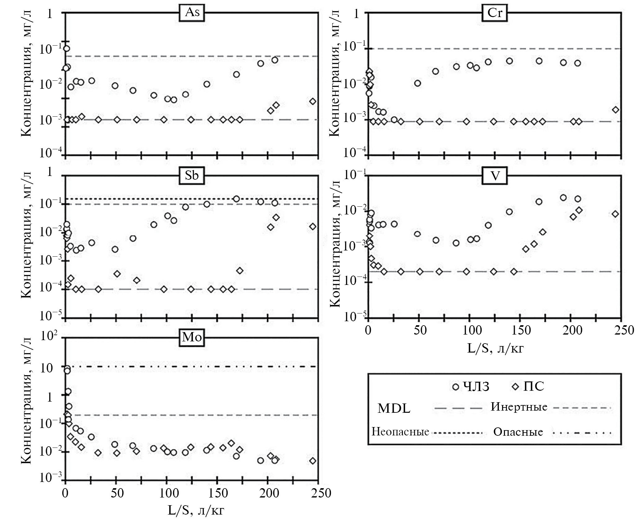 Выщелачивание As, Cr, Sb и V из образцов ЧЛС было выше, чем для ПС, где их содержание было на уровне предела обнаружения. Поведение Mo при выщелачивании из обоих образцов было сходным: концентрация в растворе снизилась в начальный период, а затем выровнялась до 1 · 10–2 мг/л. Первоначальное выделение Мо из ЧЛЗ соответствовало ограничениям для опасных отходов, тогда как ПС можно было отнести к инертным отходам. Для обоих образцов короткий начальный период выщелачивания Cr, Sb и V характеризовался снижением концентраций.