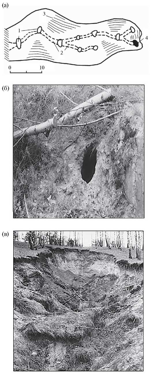Рис. 5. Схема (а) и формы проявления тоннельной эрозии: б – суффозионный колодец; в – суффозионно-провальный овраг. 1 – колодцы; 2 – связывающие их тоннели; 3 – оползни и осыпи; 4 – водобойный колодец [4].