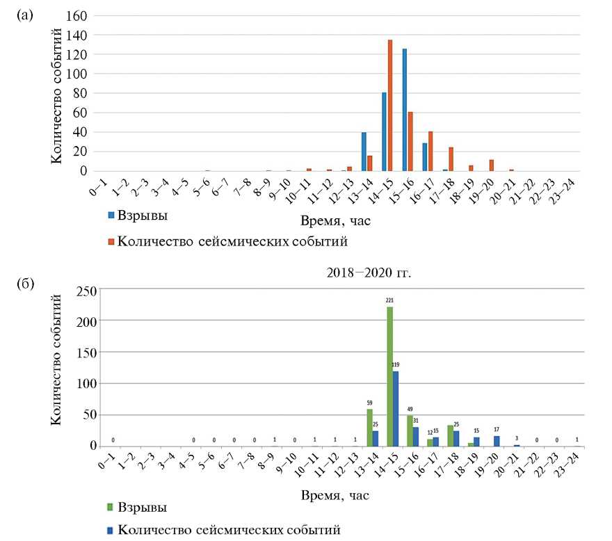 Сопоставим промышленные взрывы с зафиксированными сейсмическими событиями на ближней территории от Киембаевского рудника в пределах 20 км за период 2018—2020 гг. На графике (рис. 5а) заметно, что максимальное количество зарегистрированных сейсмических событий пришлось на временные промежутки после проведения взрывных работ (коэффициент корреляции 0.89), что свидетельствует об их временной взаимосвязи. Такая же взаимосвязь прослеживается и на Весеннем руднике (коэффициент корреляции 0.89), где наибольшее количество взрывов происходило в 14:30. При этом наибольшее количество зарегистрированных событий приходится также на промежуток времени 14:00—15:00 (рис. 5б).
