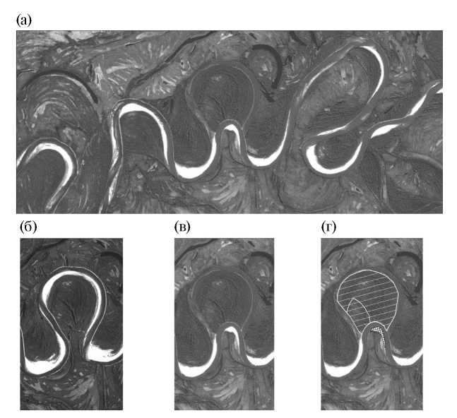Рис. 1. Типичное изображение речной поймы на материалах космической съемки: а – участок р. Хейгияха, б – пойменная излучина космическом снимке 1964 г., в – эта же излучина на снимке 2017 г. (произошло спрямление излучины), г – сегменты в пределах излучины (молодые сегменты показаны решетчатой штриховкой, старые — наклонной штриховкой).
