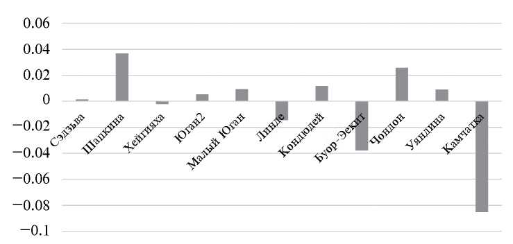 Рис. 3. Нормированное изменение средних длин стрел Δl¯ формирующихся сегментов (реки ранжированы по местоположению участка с запада на восток).