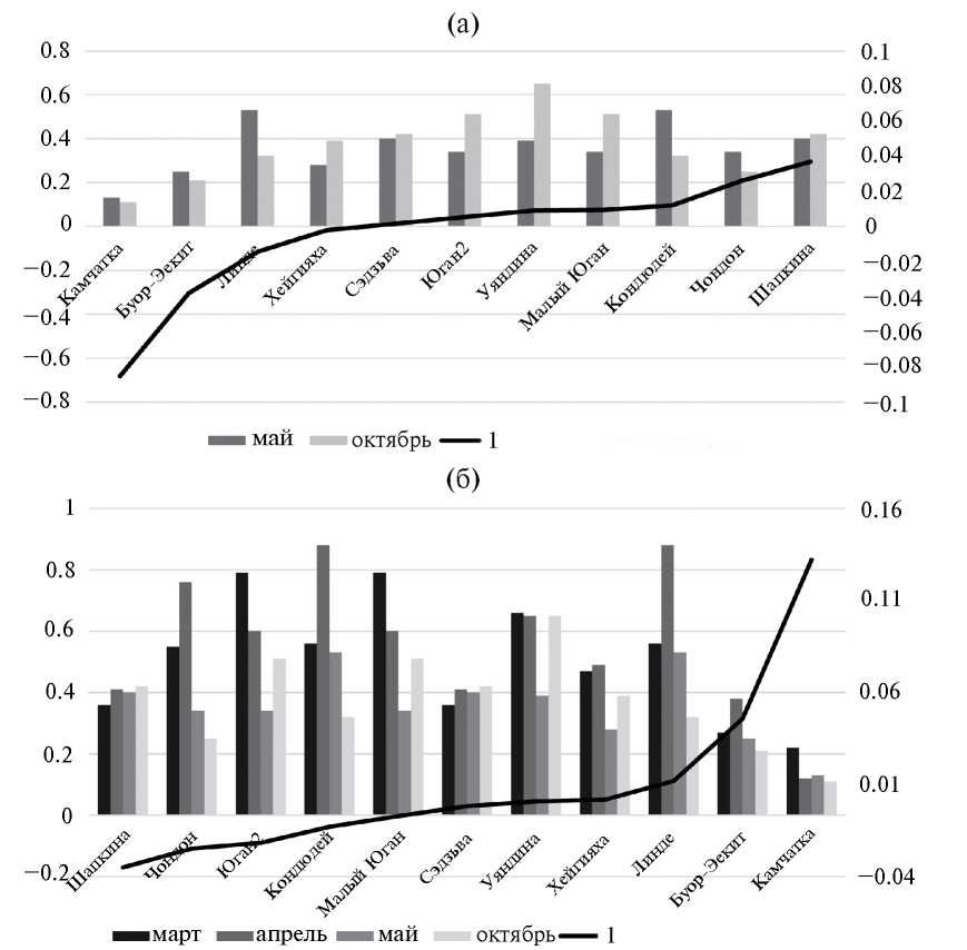 Было сделано допущение, что об интенсивности флювиального процесса может свидетельствовать, не только намыв кос и, как следствие, увеличение размеров сегмента и его стрелы (в этом случае Δl¯ будет иметь положительное значение), но и прорыв меандров и формирование новых сегментов (в этом случае Δl¯ будет иметь отрицательное значение). Так как, и то, и другое события являются показателем интенсивных флювиальных процессов, была рассчитана корреляция для взятых по модулю Δl¯ и Δλ с трендами аномалий температуры. Отмечена значимая отрицательная корреляция Δl¯ и трендов аномалий температуры в марте, апреле, мае и октябре и значимая отрицательная корреляции Δλ и трендов аномалий температуры в апреле, мае и октябре. Корреляция трендов аномалий температуры с абсолютными значениями изменений как параметра λ, так и изменений средних длин стрел Δl¯ выражена сильнее, чем при учете знака параметров. Причем в случае абсолютных значений коэффициент корреляции оказался отрицательным не только для Δλ, но и для изменения средних длин стрел Δl¯.