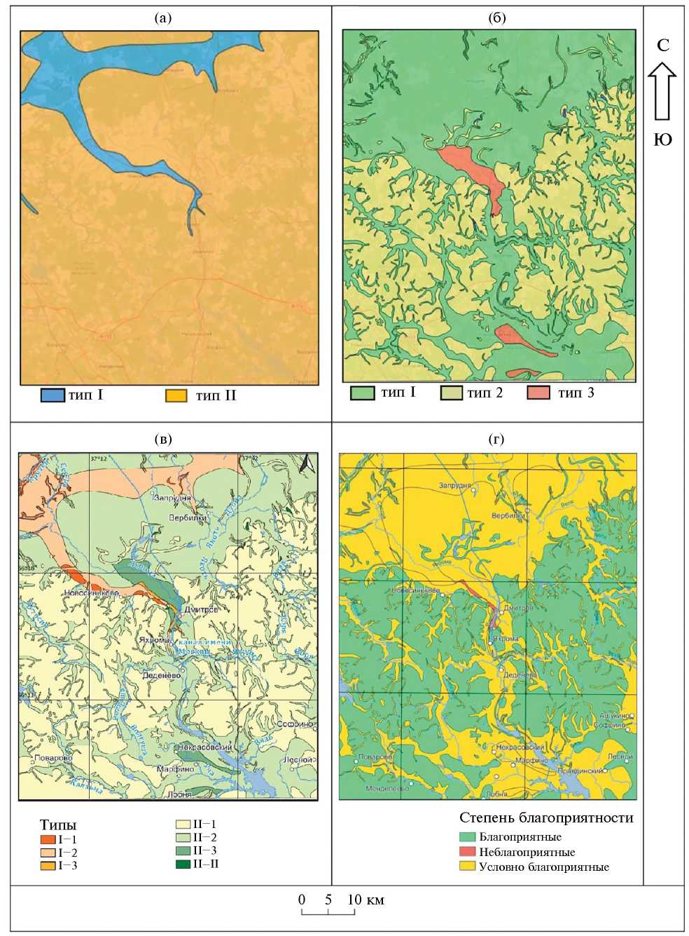 Рис. 1. Инженерно-геологическое районирование Московской обл. для размещения полигонов ТКО (репрезентативный участок − Дмитровский городской округ и окрестности): а – вспомогательный информационный слой “типы дочетвертичных отложений”, б – вспомогательный информационный слой “типы четвертичных отложений”, в – карта типологического районирования, г – карта оценочного районирования. Условные обозначения см. табл. 1 и 2.