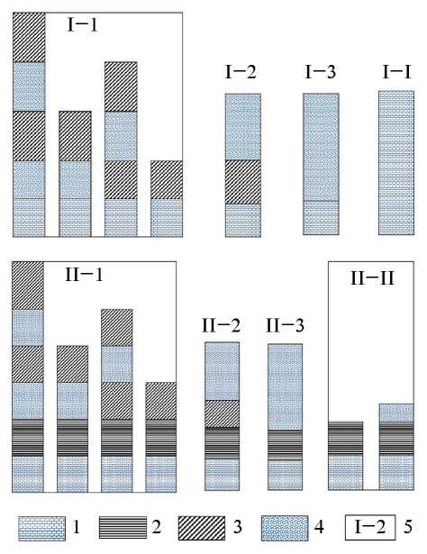 Рис. 2. Типовые разрезы грунтовых толщ Московской обл. [3]. Условные обозначения: 1 – известняки с прослоями глин, доломитов и мергелей, хорошо проницаемые, водоносные и частично обводненные, 2 – глины, слабопроницаемые, 3 – моренные суглинки, слабопроницаемые, 4 – пески, хорошо проницаемые и обводненные, 5 – индекс типа грунтовых толщ.