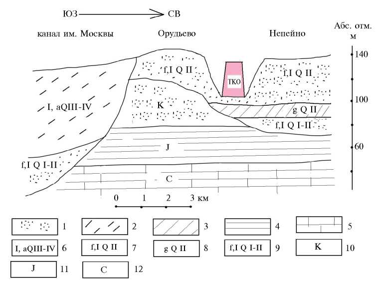Рис. 3. Схема геологического строения в окрестностях полигона ТКО Непейно [3]. Условные обозначения: 1 – пески, 2 – песчано-глинистые отложения, 3 – суглинки, 4 – глины, 5 – известняки, 6 – верхнечетвертичные, современные озерно-аллювиальные отложения, 7 – среднечетвертичные флювиогляциальные и озерные отложения, 8 – среднечетвертичные ледниковые отложения (московская морена), 9 – нижне-, среднечетвертичные флювиогляциальные и озерные отложения, 10 – отложения меловой системы, 11 – отложения юрской системы, 12 – отложения каменноугольной системы.