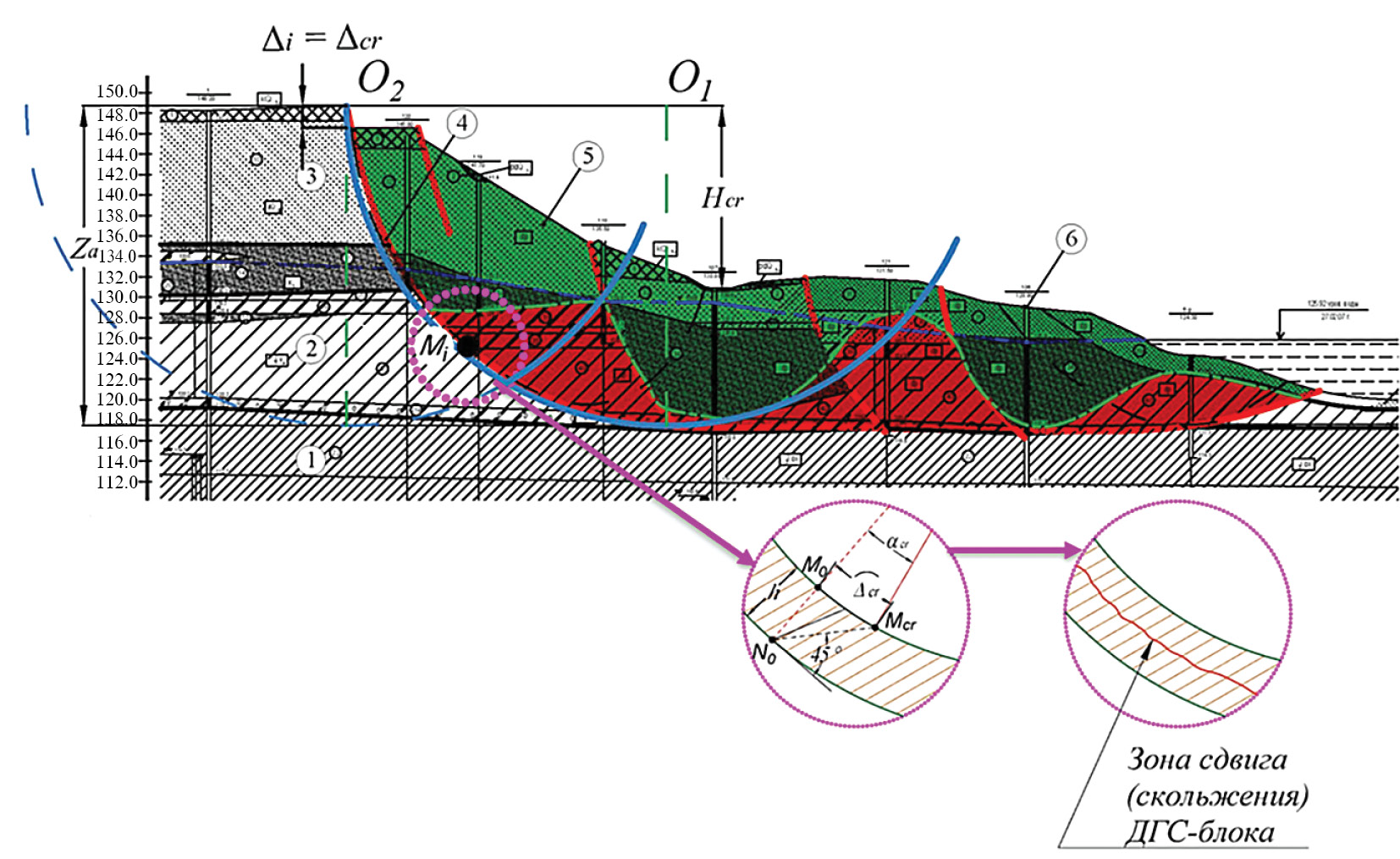 Выявление условий образования следующего блока. На основе расчетов было показано, что ДГС с центром О2 (см. рис. 4) достигнет предельного состояния, когда оползневой ДГС-блок с центром О1 осядет до уровня оползневой террасы, т.е. на Hcr.