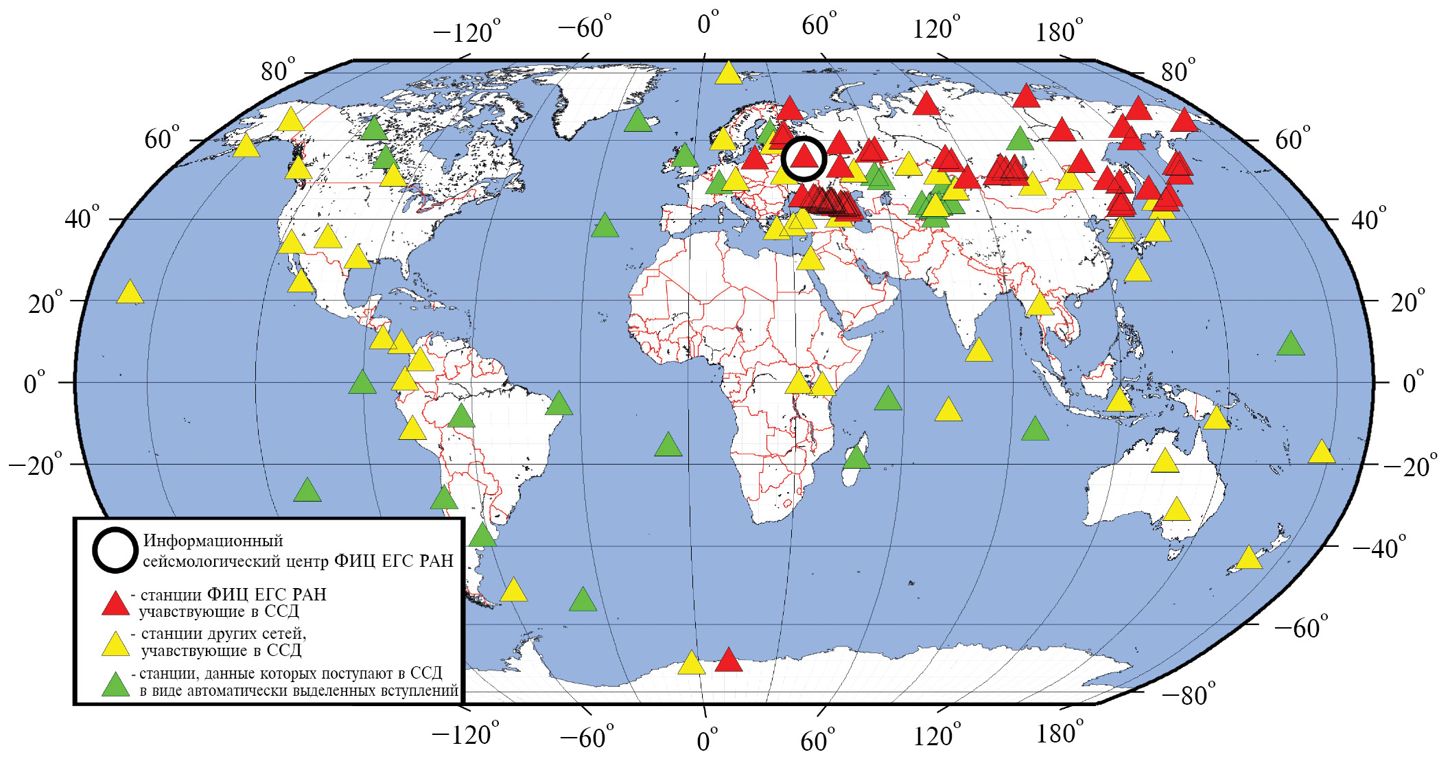 Рис. 1. Сейсмические станции, данные которых используются в ССД ФИЦ ЕГС РАН в режиме, близком к реальному времени по [2].