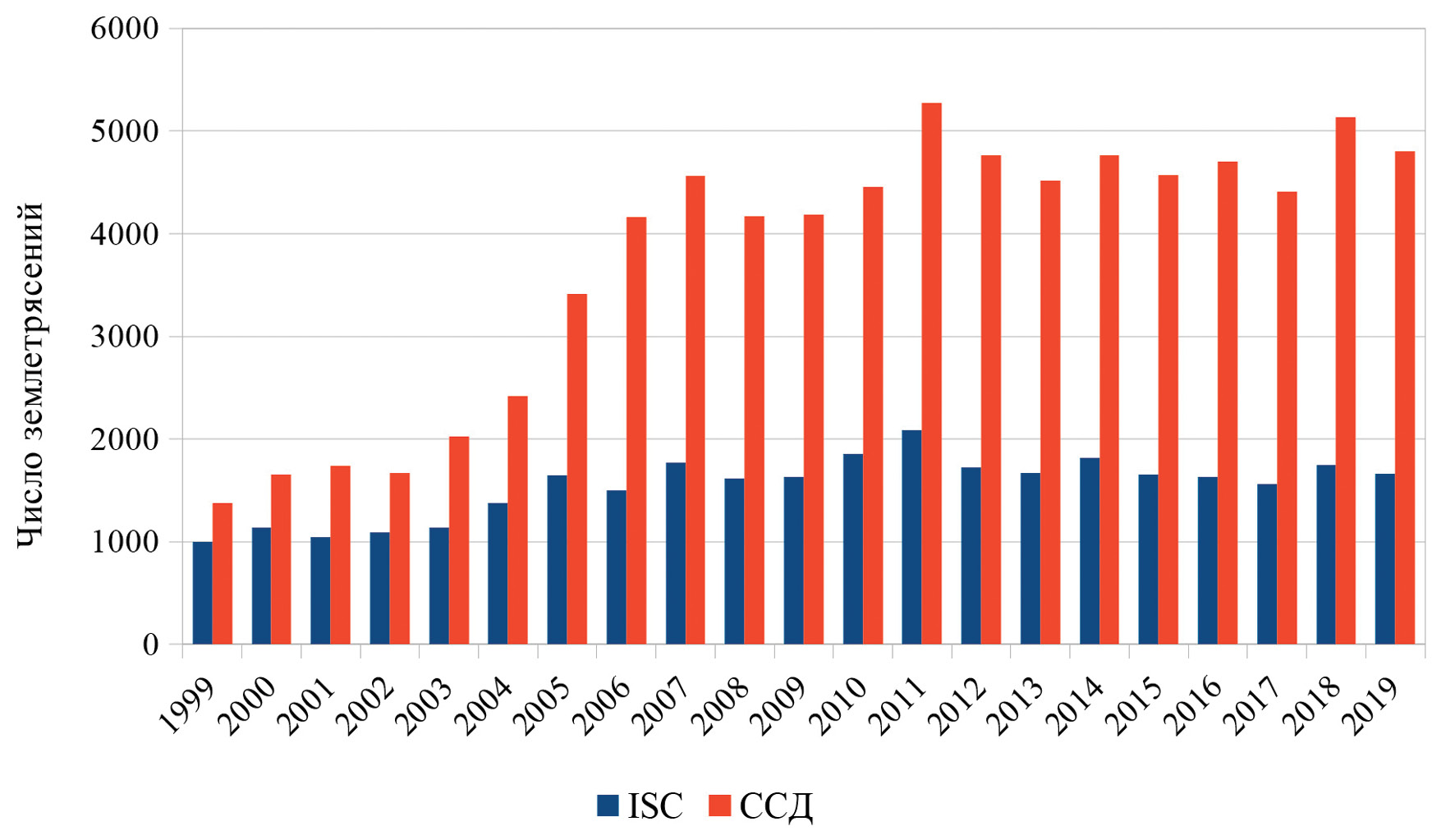 На рис. 2 приведена информация о количестве используемых в исследовании событий за период 1999–2019 гг. Число зарегистрированных ССД событий возрастало с 1378 до 4560 в период с 1999 по 2007 г. После 2007 г. среднее число зарегистрированных ССД событий в год составило около 4500. Ежегодное число событий в инструментальном каталоге ISC-GEM за рассматриваемый период изменялось от 1001 до 2083 (в среднем 1500 событий в год). Отчасти это произошло за счет увеличения числа станций в обработке землетрясений (см. табл. 1).