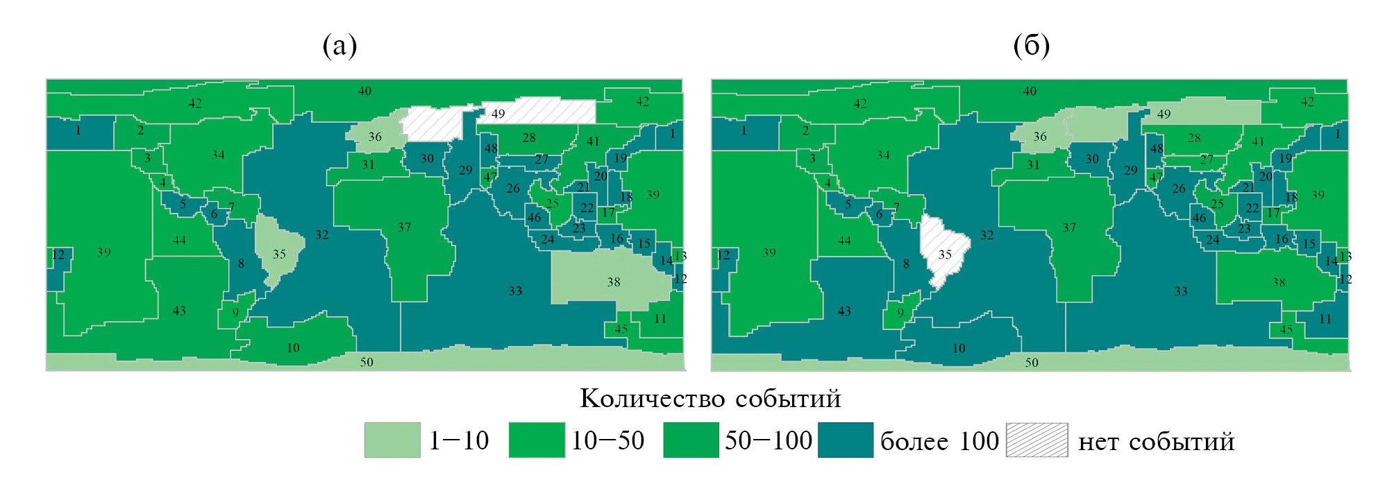 Рис. 3. Распределение числа исследуемых землетрясений по регионам Флинна–Энгдала за периоды времени: а) до 2010 г.; б) после 2010 г.