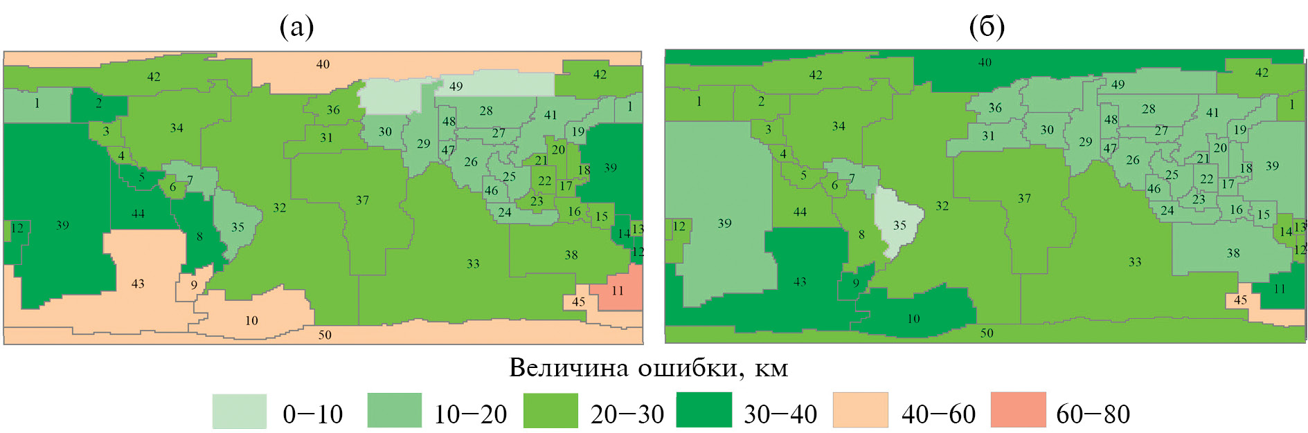 За период 2010–2019 гг. значения погрешностей ΔR уменьшаются в 2 раза для всех регионов. Максимальные значения ошибок в определении координат ΔR, полученные для регионов 44 и 45, составляют 25 км; минимальные значения составляют 8 км для зоны 41 и 6 км для зоны 50.
