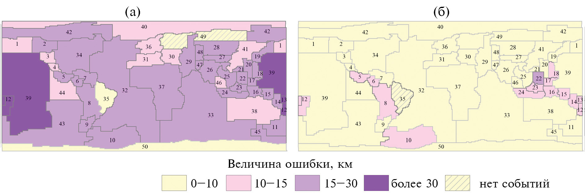 На рис. 3 указано количество исследуемых событий по зонам Флинна–Энгдала [16] для двух временных периодов. Оценка погрешностей в определении параметров сильных землетрясений выполнялась для 50 сейсмических регионов (табл. 2).