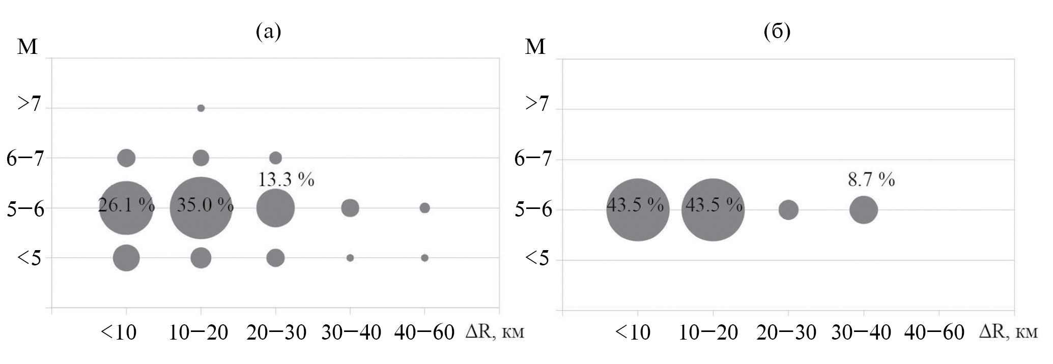Рис. 7. Распределение событий по разнице определения координат ΔR в зависимости от магнитуды: а − зона FE 30; б − Северный Кавказ; неподписанные кружки − < 5% событий.